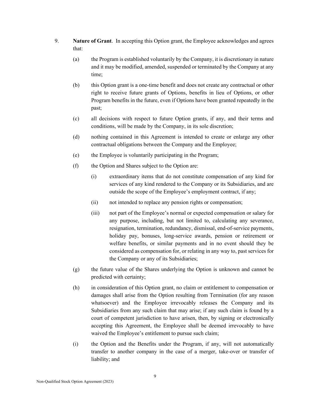 9 Non-Qualified Stock Option Agreement (2023) 9. Nature of Grant. In accepting this Option grant, the Employee acknowledges and agrees that: (a) the Program is established voluntarily by the Company, it is discretionary in nature and it may be modified, amended, suspended or terminated by the Company at any time; (b) this Option grant is a one-time benefit and does not create any contractual or other right to receive future grants of Options, benefits in lieu of Options, or other Program benefits in the future, even if Options have been granted repeatedly in the past; (c) all decisions with respect to future Option grants, if any, and their terms and conditions, will be made by the Company, in its sole discretion; (d) nothing contained in this Agreement is intended to create or enlarge any other contractual obligations between the Company and the Employee; (e) the Employee is voluntarily participating in the Program; (f) the Option and Shares subject to the Option are: (i) extraordinary items that do not constitute compensation of any kind for services of any kind rendered to the Company or its Subsidiaries, and are outside the scope of the Employee’s employment contract, if any; (ii) not intended to replace any pension rights or compensation; (iii) not part of the Employee’s normal or expected compensation or salary for any purpose, including, but not limited to, calculating any severance, resignation, termination, redundancy, dismissal, end-of-service payments, holiday pay, bonuses, long-service awards, pension or retirement or welfare benefits, or similar payments and in no event should they be considered as compensation for, or relating in any way to, past services for the Company or any of its Subsidiaries; (g) the future value of the Shares underlying the Option is unknown and cannot be predicted with certainty; (h) in consideration of this Option grant, no claim or entitlement to compensation or damages shall arise from the Option resulting from Termination (for any reason whatsoever) and the Employee irrevocably releases the Company and its Subsidiaries from any such claim that may arise; if any such claim is found by a court of competent jurisdiction to have arisen, then, by signing or electronically accepting this Agreement, the Employee shall be deemed irrevocably to have waived the Employee’s entitlement to pursue such claim; (i) the Option and the Benefits under the Program, if any, will not automatically transfer to another company in the case of a merger, take-over or transfer of liability; and