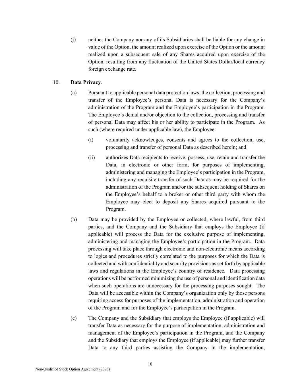 10 Non-Qualified Stock Option Agreement (2023) (j) neither the Company nor any of its Subsidiaries shall be liable for any change in value of the Option, the amount realized upon exercise of the Option or the amount realized upon a subsequent sale of any Shares acquired upon exercise of the Option, resulting from any fluctuation of the United States Dollar/local currency foreign exchange rate. 10. Data Privacy. (a) Pursuant to applicable personal data protection laws, the collection, processing and transfer of the Employee’s personal Data is necessary for the Company’s administration of the Program and the Employee’s participation in the Program. The Employee’s denial and/or objection to the collection, processing and transfer of personal Data may affect his or her ability to participate in the Program. As such (where required under applicable law), the Employee: (i) voluntarily acknowledges, consents and agrees to the collection, use, processing and transfer of personal Data as described herein; and (ii) authorizes Data recipients to receive, possess, use, retain and transfer the Data, in electronic or other form, for purposes of implementing, administering and managing the Employee’s participation in the Program, including any requisite transfer of such Data as may be required for the administration of the Program and/or the subsequent holding of Shares on the Employee’s behalf to a broker or other third party with whom the Employee may elect to deposit any Shares acquired pursuant to the Program. (b) Data may be provided by the Employee or collected, where lawful, from third parties, and the Company and the Subsidiary that employs the Employee (if applicable) will process the Data for the exclusive purpose of implementing, administering and managing the Employee’s participation in the Program. Data processing will take place through electronic and non-electronic means according to logics and procedures strictly correlated to the purposes for which the Data is collected and with confidentiality and security provisions as set forth by applicable laws and regulations in the Employee’s country of residence. Data processing operations will be performed minimizing the use of personal and identification data when such operations are unnecessary for the processing purposes sought. The Data will be accessible within the Company’s organization only by those persons requiring access for purposes of the implementation, administration and operation of the Program and for the Employee’s participation in the Program. (c) The Company and the Subsidiary that employs the Employee (if applicable) will transfer Data as necessary for the purpose of implementation, administration and management of the Employee’s participation in the Program, and the Company and the Subsidiary that employs the Employee (if applicable) may further transfer Data to any third parties assisting the Company in the implementation,