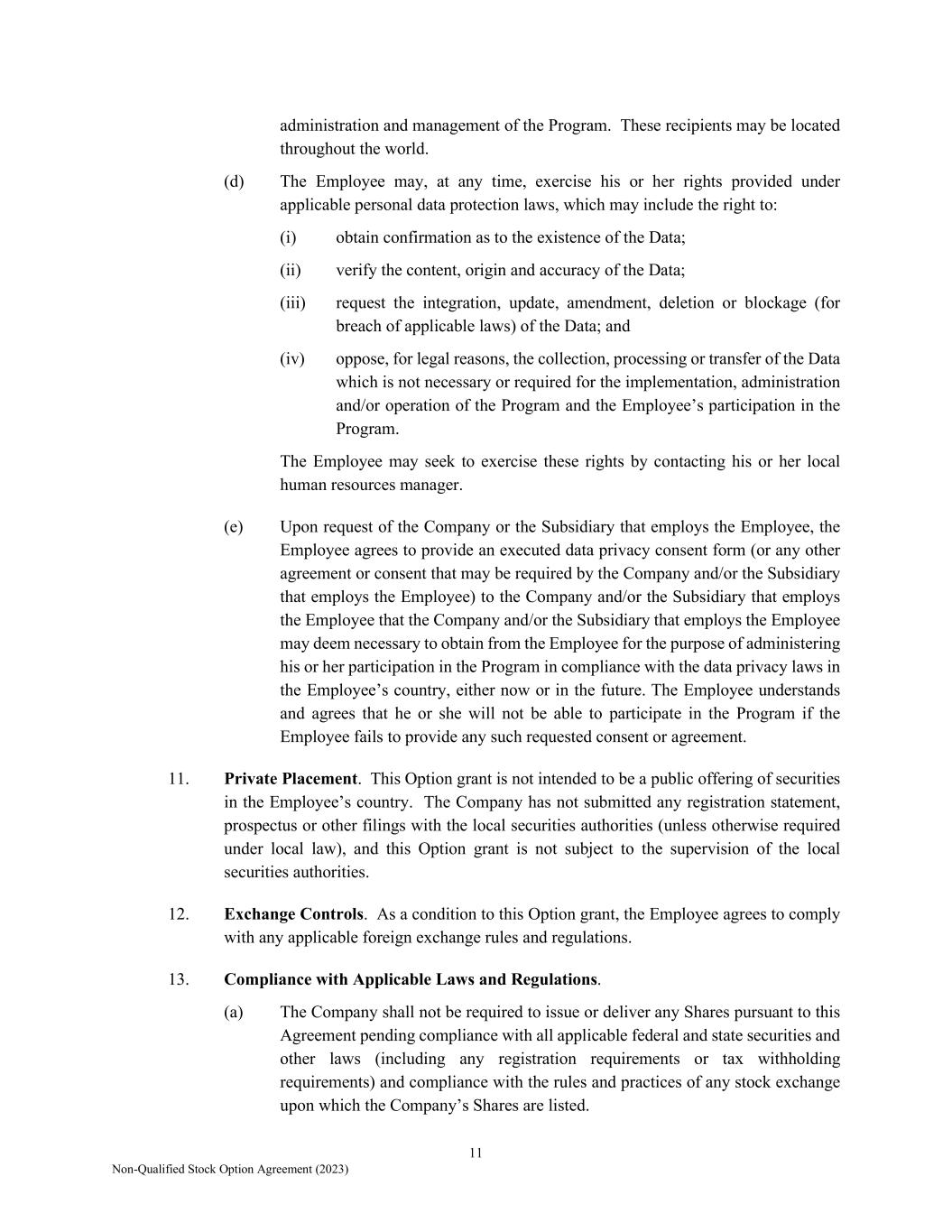 11 Non-Qualified Stock Option Agreement (2023) administration and management of the Program. These recipients may be located throughout the world. (d) The Employee may, at any time, exercise his or her rights provided under applicable personal data protection laws, which may include the right to: (i) obtain confirmation as to the existence of the Data; (ii) verify the content, origin and accuracy of the Data; (iii) request the integration, update, amendment, deletion or blockage (for breach of applicable laws) of the Data; and (iv) oppose, for legal reasons, the collection, processing or transfer of the Data which is not necessary or required for the implementation, administration and/or operation of the Program and the Employee’s participation in the Program. The Employee may seek to exercise these rights by contacting his or her local human resources manager. (e) Upon request of the Company or the Subsidiary that employs the Employee, the Employee agrees to provide an executed data privacy consent form (or any other agreement or consent that may be required by the Company and/or the Subsidiary that employs the Employee) to the Company and/or the Subsidiary that employs the Employee that the Company and/or the Subsidiary that employs the Employee may deem necessary to obtain from the Employee for the purpose of administering his or her participation in the Program in compliance with the data privacy laws in the Employee’s country, either now or in the future. The Employee understands and agrees that he or she will not be able to participate in the Program if the Employee fails to provide any such requested consent or agreement. 11. Private Placement. This Option grant is not intended to be a public offering of securities in the Employee’s country. The Company has not submitted any registration statement, prospectus or other filings with the local securities authorities (unless otherwise required under local law), and this Option grant is not subject to the supervision of the local securities authorities. 12. Exchange Controls. As a condition to this Option grant, the Employee agrees to comply with any applicable foreign exchange rules and regulations. 13. Compliance with Applicable Laws and Regulations. (a) The Company shall not be required to issue or deliver any Shares pursuant to this Agreement pending compliance with all applicable federal and state securities and other laws (including any registration requirements or tax withholding requirements) and compliance with the rules and practices of any stock exchange upon which the Company’s Shares are listed.