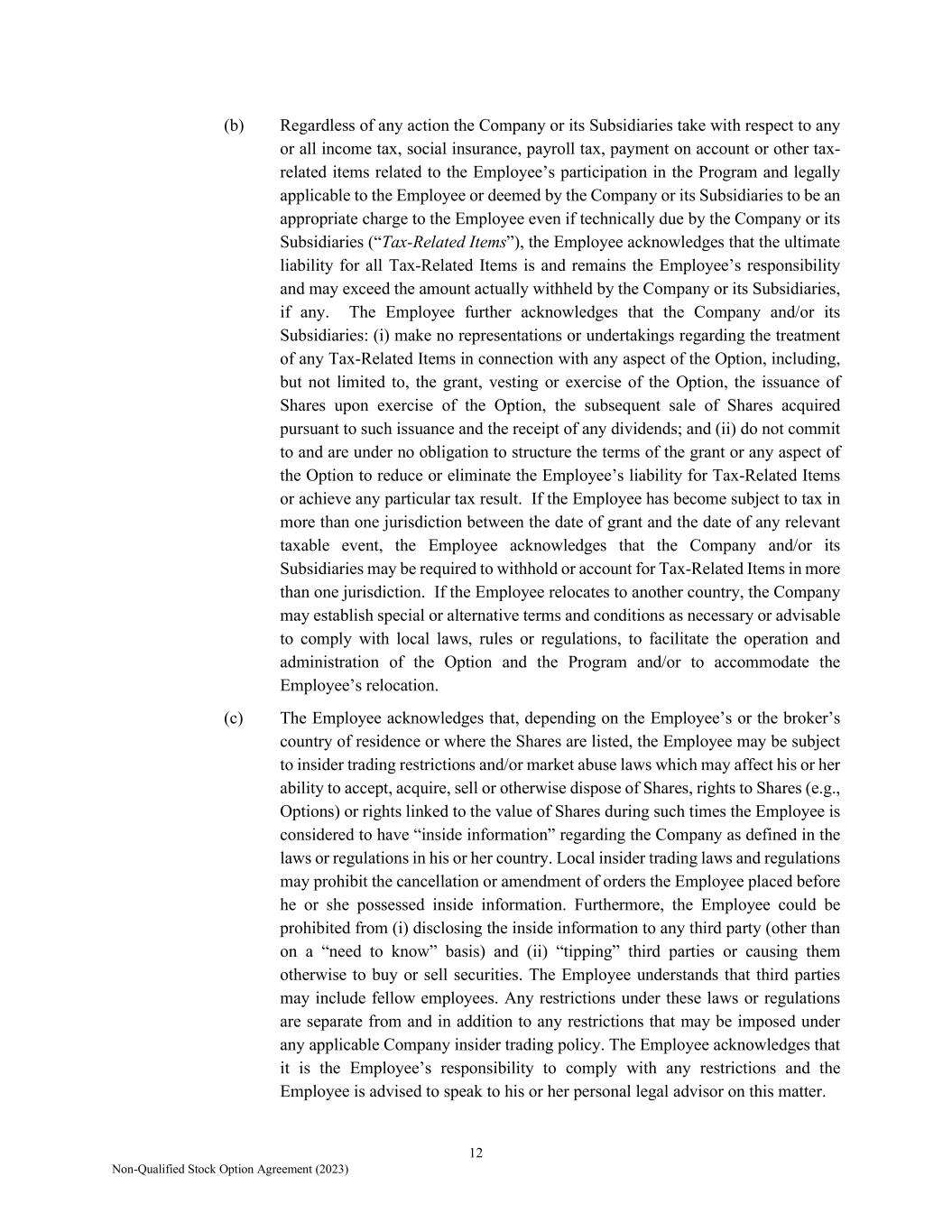 12 Non-Qualified Stock Option Agreement (2023) (b) Regardless of any action the Company or its Subsidiaries take with respect to any or all income tax, social insurance, payroll tax, payment on account or other tax- related items related to the Employee’s participation in the Program and legally applicable to the Employee or deemed by the Company or its Subsidiaries to be an appropriate charge to the Employee even if technically due by the Company or its Subsidiaries (“Tax-Related Items”), the Employee acknowledges that the ultimate liability for all Tax-Related Items is and remains the Employee’s responsibility and may exceed the amount actually withheld by the Company or its Subsidiaries, if any. The Employee further acknowledges that the Company and/or its Subsidiaries: (i) make no representations or undertakings regarding the treatment of any Tax-Related Items in connection with any aspect of the Option, including, but not limited to, the grant, vesting or exercise of the Option, the issuance of Shares upon exercise of the Option, the subsequent sale of Shares acquired pursuant to such issuance and the receipt of any dividends; and (ii) do not commit to and are under no obligation to structure the terms of the grant or any aspect of the Option to reduce or eliminate the Employee’s liability for Tax-Related Items or achieve any particular tax result. If the Employee has become subject to tax in more than one jurisdiction between the date of grant and the date of any relevant taxable event, the Employee acknowledges that the Company and/or its Subsidiaries may be required to withhold or account for Tax-Related Items in more than one jurisdiction. If the Employee relocates to another country, the Company may establish special or alternative terms and conditions as necessary or advisable to comply with local laws, rules or regulations, to facilitate the operation and administration of the Option and the Program and/or to accommodate the Employee’s relocation. (c) The Employee acknowledges that, depending on the Employee’s or the broker’s country of residence or where the Shares are listed, the Employee may be subject to insider trading restrictions and/or market abuse laws which may affect his or her ability to accept, acquire, sell or otherwise dispose of Shares, rights to Shares (e.g., Options) or rights linked to the value of Shares during such times the Employee is considered to have “inside information” regarding the Company as defined in the laws or regulations in his or her country. Local insider trading laws and regulations may prohibit the cancellation or amendment of orders the Employee placed before he or she possessed inside information. Furthermore, the Employee could be prohibited from (i) disclosing the inside information to any third party (other than on a “need to know” basis) and (ii) “tipping” third parties or causing them otherwise to buy or sell securities. The Employee understands that third parties may include fellow employees. Any restrictions under these laws or regulations are separate from and in addition to any restrictions that may be imposed under any applicable Company insider trading policy. The Employee acknowledges that it is the Employee’s responsibility to comply with any restrictions and the Employee is advised to speak to his or her personal legal advisor on this matter.