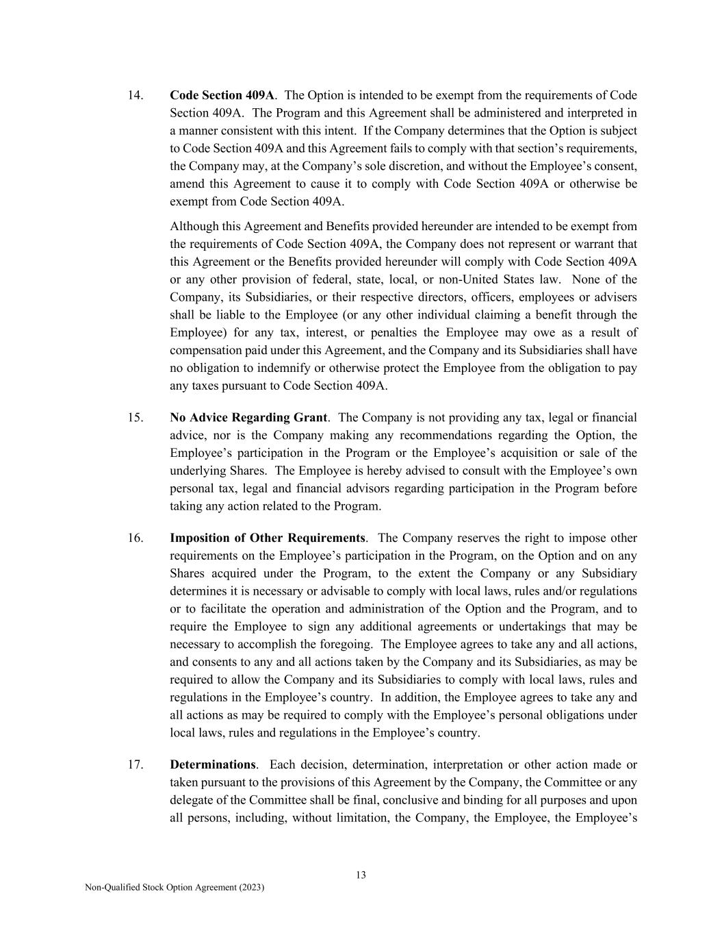 13 Non-Qualified Stock Option Agreement (2023) 14. Code Section 409A. The Option is intended to be exempt from the requirements of Code Section 409A. The Program and this Agreement shall be administered and interpreted in a manner consistent with this intent. If the Company determines that the Option is subject to Code Section 409A and this Agreement fails to comply with that section’s requirements, the Company may, at the Company’s sole discretion, and without the Employee’s consent, amend this Agreement to cause it to comply with Code Section 409A or otherwise be exempt from Code Section 409A. Although this Agreement and Benefits provided hereunder are intended to be exempt from the requirements of Code Section 409A, the Company does not represent or warrant that this Agreement or the Benefits provided hereunder will comply with Code Section 409A or any other provision of federal, state, local, or non-United States law. None of the Company, its Subsidiaries, or their respective directors, officers, employees or advisers shall be liable to the Employee (or any other individual claiming a benefit through the Employee) for any tax, interest, or penalties the Employee may owe as a result of compensation paid under this Agreement, and the Company and its Subsidiaries shall have no obligation to indemnify or otherwise protect the Employee from the obligation to pay any taxes pursuant to Code Section 409A. 15. No Advice Regarding Grant. The Company is not providing any tax, legal or financial advice, nor is the Company making any recommendations regarding the Option, the Employee’s participation in the Program or the Employee’s acquisition or sale of the underlying Shares. The Employee is hereby advised to consult with the Employee’s own personal tax, legal and financial advisors regarding participation in the Program before taking any action related to the Program. 16. Imposition of Other Requirements. The Company reserves the right to impose other requirements on the Employee’s participation in the Program, on the Option and on any Shares acquired under the Program, to the extent the Company or any Subsidiary determines it is necessary or advisable to comply with local laws, rules and/or regulations or to facilitate the operation and administration of the Option and the Program, and to require the Employee to sign any additional agreements or undertakings that may be necessary to accomplish the foregoing. The Employee agrees to take any and all actions, and consents to any and all actions taken by the Company and its Subsidiaries, as may be required to allow the Company and its Subsidiaries to comply with local laws, rules and regulations in the Employee’s country. In addition, the Employee agrees to take any and all actions as may be required to comply with the Employee’s personal obligations under local laws, rules and regulations in the Employee’s country. 17. Determinations. Each decision, determination, interpretation or other action made or taken pursuant to the provisions of this Agreement by the Company, the Committee or any delegate of the Committee shall be final, conclusive and binding for all purposes and upon all persons, including, without limitation, the Company, the Employee, the Employee’s