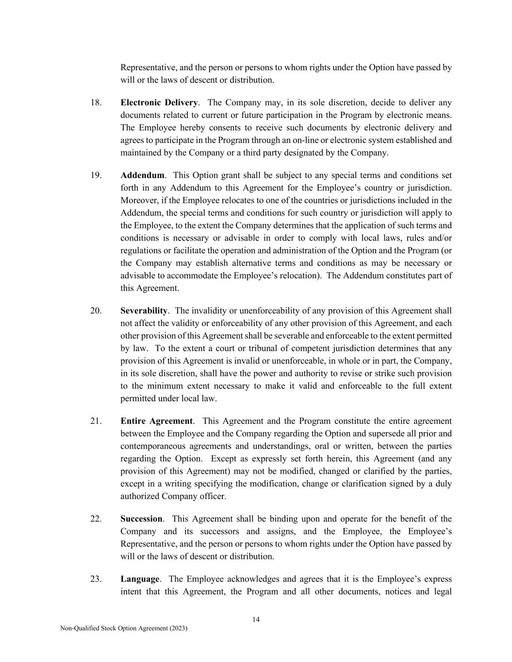 14 Non-Qualified Stock Option Agreement (2023) Representative, and the person or persons to whom rights under the Option have passed by will or the laws of descent or distribution. 18. Electronic Delivery. The Company may, in its sole discretion, decide to deliver any documents related to current or future participation in the Program by electronic means. The Employee hereby consents to receive such documents by electronic delivery and agrees to participate in the Program through an on-line or electronic system established and maintained by the Company or a third party designated by the Company. 19. Addendum. This Option grant shall be subject to any special terms and conditions set forth in any Addendum to this Agreement for the Employee’s country or jurisdiction. Moreover, if the Employee relocates to one of the countries or jurisdictions included in the Addendum, the special terms and conditions for such country or jurisdiction will apply to the Employee, to the extent the Company determines that the application of such terms and conditions is necessary or advisable in order to comply with local laws, rules and/or regulations or facilitate the operation and administration of the Option and the Program (or the Company may establish alternative terms and conditions as may be necessary or advisable to accommodate the Employee’s relocation). The Addendum constitutes part of this Agreement. 20. Severability. The invalidity or unenforceability of any provision of this Agreement shall not affect the validity or enforceability of any other provision of this Agreement, and each other provision of this Agreement shall be severable and enforceable to the extent permitted by law. To the extent a court or tribunal of competent jurisdiction determines that any provision of this Agreement is invalid or unenforceable, in whole or in part, the Company, in its sole discretion, shall have the power and authority to revise or strike such provision to the minimum extent necessary to make it valid and enforceable to the full extent permitted under local law. 21. Entire Agreement. This Agreement and the Program constitute the entire agreement between the Employee and the Company regarding the Option and supersede all prior and contemporaneous agreements and understandings, oral or written, between the parties regarding the Option. Except as expressly set forth herein, this Agreement (and any provision of this Agreement) may not be modified, changed or clarified by the parties, except in a writing specifying the modification, change or clarification signed by a duly authorized Company officer. 22. Succession. This Agreement shall be binding upon and operate for the benefit of the Company and its successors and assigns, and the Employee, the Employee’s Representative, and the person or persons to whom rights under the Option have passed by will or the laws of descent or distribution. 23. Language. The Employee acknowledges and agrees that it is the Employee’s express intent that this Agreement, the Program and all other documents, notices and legal