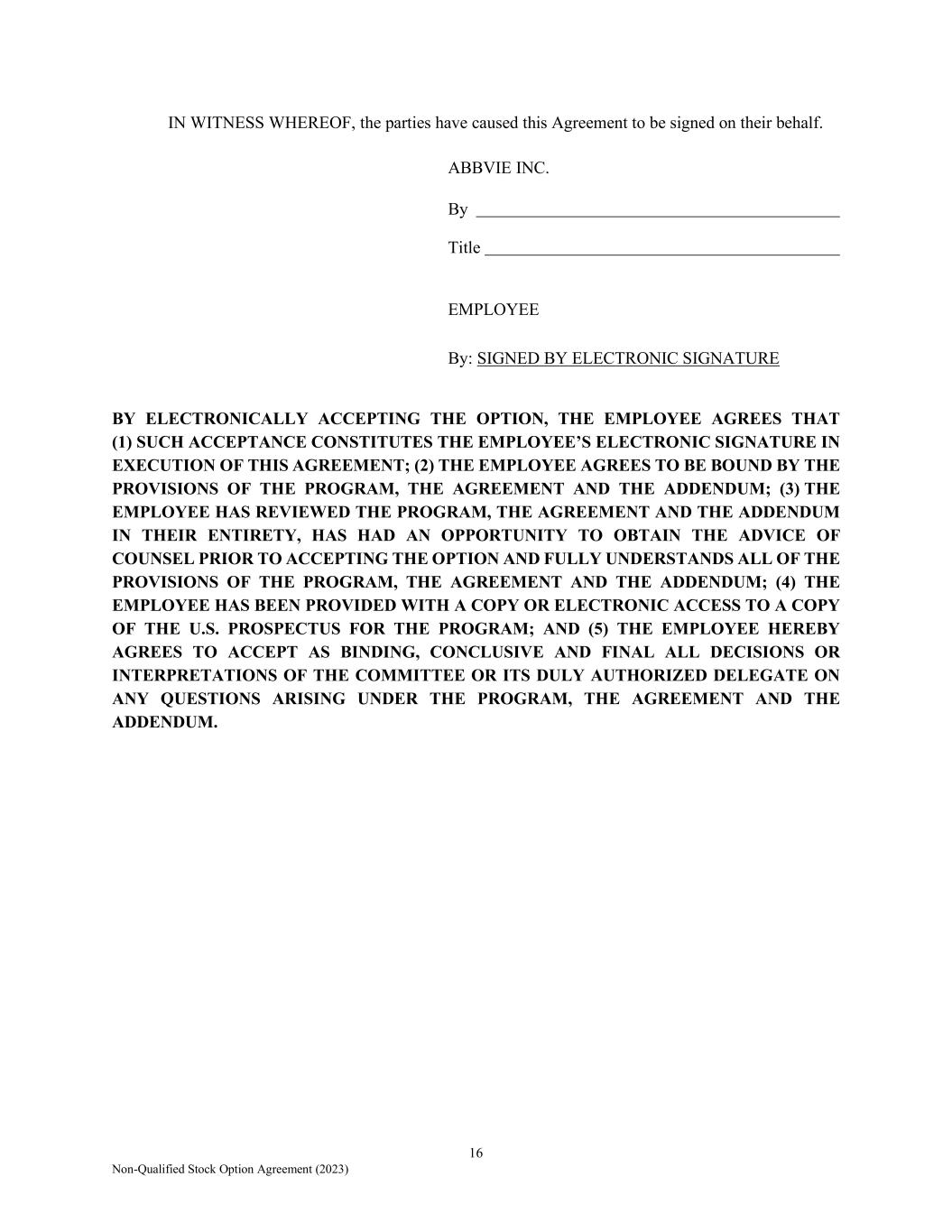 16 Non-Qualified Stock Option Agreement (2023) IN WITNESS WHEREOF, the parties have caused this Agreement to be signed on their behalf. ABBVIE INC. By Title EMPLOYEE By: SIGNED BY ELECTRONIC SIGNATURE BY ELECTRONICALLY ACCEPTING THE OPTION, THE EMPLOYEE AGREES THAT (1) SUCH ACCEPTANCE CONSTITUTES THE EMPLOYEE’S ELECTRONIC SIGNATURE IN EXECUTION OF THIS AGREEMENT; (2) THE EMPLOYEE AGREES TO BE BOUND BY THE PROVISIONS OF THE PROGRAM, THE AGREEMENT AND THE ADDENDUM; (3) THE EMPLOYEE HAS REVIEWED THE PROGRAM, THE AGREEMENT AND THE ADDENDUM IN THEIR ENTIRETY, HAS HAD AN OPPORTUNITY TO OBTAIN THE ADVICE OF COUNSEL PRIOR TO ACCEPTING THE OPTION AND FULLY UNDERSTANDS ALL OF THE PROVISIONS OF THE PROGRAM, THE AGREEMENT AND THE ADDENDUM; (4) THE EMPLOYEE HAS BEEN PROVIDED WITH A COPY OR ELECTRONIC ACCESS TO A COPY OF THE U.S. PROSPECTUS FOR THE PROGRAM; AND (5) THE EMPLOYEE HEREBY AGREES TO ACCEPT AS BINDING, CONCLUSIVE AND FINAL ALL DECISIONS OR INTERPRETATIONS OF THE COMMITTEE OR ITS DULY AUTHORIZED DELEGATE ON ANY QUESTIONS ARISING UNDER THE PROGRAM, THE AGREEMENT AND THE ADDENDUM.