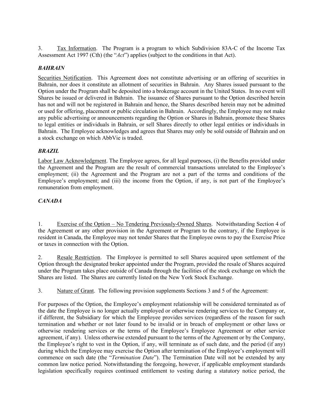 3. Tax Information. The Program is a program to which Subdivision 83A-C of the Income Tax Assessment Act 1997 (Cth) (the “Act”) applies (subject to the conditions in that Act). BAHRAIN Securities Notification. This Agreement does not constitute advertising or an offering of securities in Bahrain, nor does it constitute an allotment of securities in Bahrain. Any Shares issued pursuant to the Option under the Program shall be deposited into a brokerage account in the United States. In no event will Shares be issued or delivered in Bahrain. The issuance of Shares pursuant to the Option described herein has not and will not be registered in Bahrain and hence, the Shares described herein may not be admitted or used for offering, placement or public circulation in Bahrain. Accordingly, the Employee may not make any public advertising or announcements regarding the Option or Shares in Bahrain, promote these Shares to legal entities or individuals in Bahrain, or sell Shares directly to other legal entities or individuals in Bahrain. The Employee acknowledges and agrees that Shares may only be sold outside of Bahrain and on a stock exchange on which AbbVie is traded. BRAZIL Labor Law Acknowledgment. The Employee agrees, for all legal purposes, (i) the Benefits provided under the Agreement and the Program are the result of commercial transactions unrelated to the Employee’s employment; (ii) the Agreement and the Program are not a part of the terms and conditions of the Employee’s employment; and (iii) the income from the Option, if any, is not part of the Employee’s remuneration from employment. CANADA 1. Exercise of the Option – No Tendering Previously-Owned Shares. Notwithstanding Section 4 of the Agreement or any other provision in the Agreement or Program to the contrary, if the Employee is resident in Canada, the Employee may not tender Shares that the Employee owns to pay the Exercise Price or taxes in connection with the Option. 2. Resale Restriction. The Employee is permitted to sell Shares acquired upon settlement of the Option through the designated broker appointed under the Program, provided the resale of Shares acquired under the Program takes place outside of Canada through the facilities of the stock exchange on which the Shares are listed. The Shares are currently listed on the New York Stock Exchange. 3. Nature of Grant. The following provision supplements Sections 3 and 5 of the Agreement: For purposes of the Option, the Employee’s employment relationship will be considered terminated as of the date the Employee is no longer actually employed or otherwise rendering services to the Company or, if different, the Subsidiary for which the Employee provides services (regardless of the reason for such termination and whether or not later found to be invalid or in breach of employment or other laws or otherwise rendering services or the terms of the Employee’s Employee Agreement or other service agreement, if any). Unless otherwise extended pursuant to the terms of the Agreement or by the Company, the Employee’s right to vest in the Option, if any, will terminate as of such date, and the period (if any) during which the Employee may exercise the Option after termination of the Employee’s employment will commence on such date (the “Termination Date”). The Termination Date will not be extended by any common law notice period. Notwithstanding the foregoing, however, if applicable employment standards legislation specifically requires continued entitlement to vesting during a statutory notice period, the