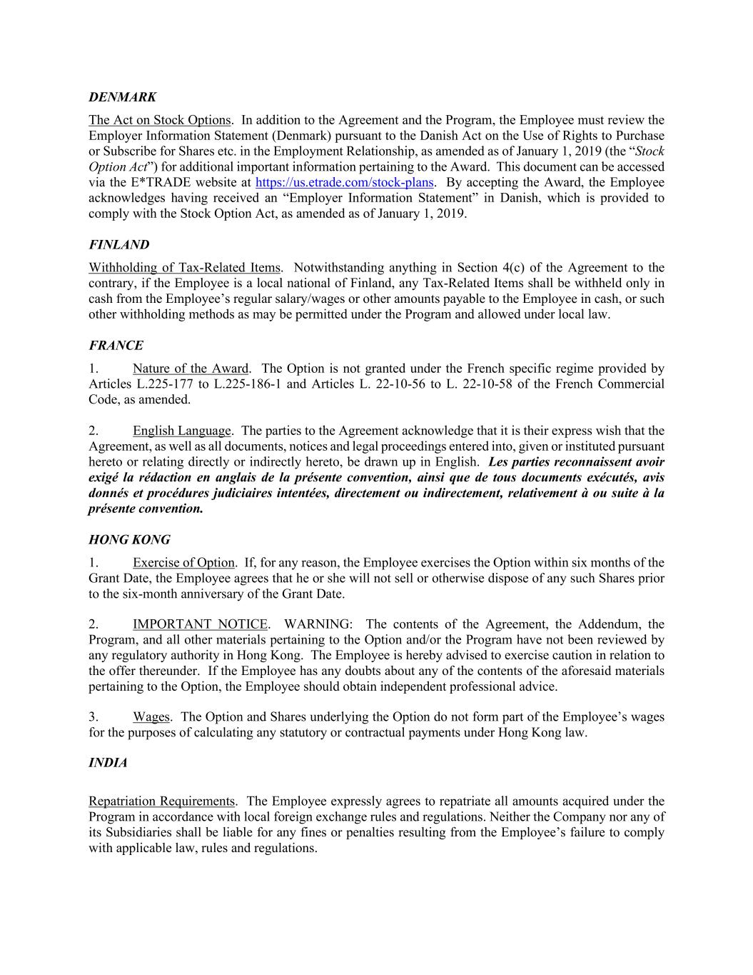 DENMARK The Act on Stock Options. In addition to the Agreement and the Program, the Employee must review the Employer Information Statement (Denmark) pursuant to the Danish Act on the Use of Rights to Purchase or Subscribe for Shares etc. in the Employment Relationship, as amended as of January 1, 2019 (the “Stock Option Act”) for additional important information pertaining to the Award. This document can be accessed via the E*TRADE website at https://us.etrade.com/stock-plans. By accepting the Award, the Employee acknowledges having received an “Employer Information Statement” in Danish, which is provided to comply with the Stock Option Act, as amended as of January 1, 2019. FINLAND Withholding of Tax-Related Items. Notwithstanding anything in Section 4(c) of the Agreement to the contrary, if the Employee is a local national of Finland, any Tax-Related Items shall be withheld only in cash from the Employee’s regular salary/wages or other amounts payable to the Employee in cash, or such other withholding methods as may be permitted under the Program and allowed under local law. FRANCE 1. Nature of the Award. The Option is not granted under the French specific regime provided by Articles L.225-177 to L.225-186-1 and Articles L. 22-10-56 to L. 22-10-58 of the French Commercial Code, as amended. 2. English Language. The parties to the Agreement acknowledge that it is their express wish that the Agreement, as well as all documents, notices and legal proceedings entered into, given or instituted pursuant hereto or relating directly or indirectly hereto, be drawn up in English. Les parties reconnaissent avoir exigé la rédaction en anglais de la présente convention, ainsi que de tous documents exécutés, avis donnés et procédures judiciaires intentées, directement ou indirectement, relativement à ou suite à la présente convention. HONG KONG 1. Exercise of Option. If, for any reason, the Employee exercises the Option within six months of the Grant Date, the Employee agrees that he or she will not sell or otherwise dispose of any such Shares prior to the six-month anniversary of the Grant Date. 2. IMPORTANT NOTICE. WARNING: The contents of the Agreement, the Addendum, the Program, and all other materials pertaining to the Option and/or the Program have not been reviewed by any regulatory authority in Hong Kong. The Employee is hereby advised to exercise caution in relation to the offer thereunder. If the Employee has any doubts about any of the contents of the aforesaid materials pertaining to the Option, the Employee should obtain independent professional advice. 3. Wages. The Option and Shares underlying the Option do not form part of the Employee’s wages for the purposes of calculating any statutory or contractual payments under Hong Kong law. INDIA Repatriation Requirements. The Employee expressly agrees to repatriate all amounts acquired under the Program in accordance with local foreign exchange rules and regulations. Neither the Company nor any of its Subsidiaries shall be liable for any fines or penalties resulting from the Employee’s failure to comply with applicable law, rules and regulations.
