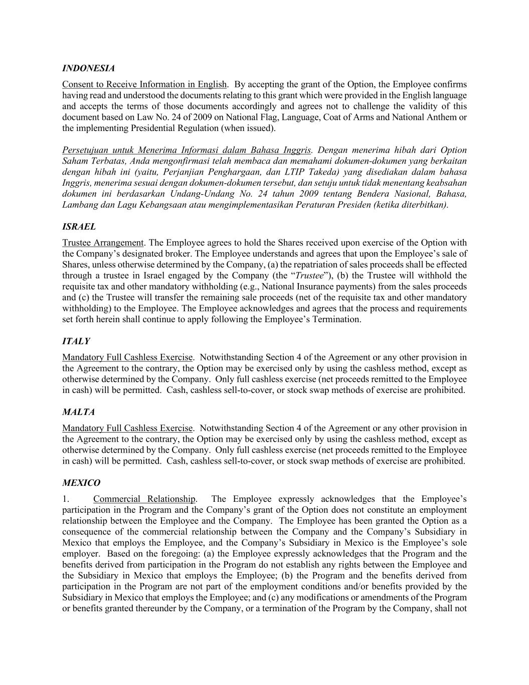INDONESIA Consent to Receive Information in English. By accepting the grant of the Option, the Employee confirms having read and understood the documents relating to this grant which were provided in the English language and accepts the terms of those documents accordingly and agrees not to challenge the validity of this document based on Law No. 24 of 2009 on National Flag, Language, Coat of Arms and National Anthem or the implementing Presidential Regulation (when issued). Persetujuan untuk Menerima Informasi dalam Bahasa Inggris. Dengan menerima hibah dari Option Saham Terbatas, Anda mengonfirmasi telah membaca dan memahami dokumen-dokumen yang berkaitan dengan hibah ini (yaitu, Perjanjian Penghargaan, dan LTIP Takeda) yang disediakan dalam bahasa Inggris, menerima sesuai dengan dokumen-dokumen tersebut, dan setuju untuk tidak menentang keabsahan dokumen ini berdasarkan Undang-Undang No. 24 tahun 2009 tentang Bendera Nasional, Bahasa, Lambang dan Lagu Kebangsaan atau mengimplementasikan Peraturan Presiden (ketika diterbitkan). ISRAEL Trustee Arrangement. The Employee agrees to hold the Shares received upon exercise of the Option with the Company’s designated broker. The Employee understands and agrees that upon the Employee’s sale of Shares, unless otherwise determined by the Company, (a) the repatriation of sales proceeds shall be effected through a trustee in Israel engaged by the Company (the “Trustee”), (b) the Trustee will withhold the requisite tax and other mandatory withholding (e.g., National Insurance payments) from the sales proceeds and (c) the Trustee will transfer the remaining sale proceeds (net of the requisite tax and other mandatory withholding) to the Employee. The Employee acknowledges and agrees that the process and requirements set forth herein shall continue to apply following the Employee’s Termination. ITALY Mandatory Full Cashless Exercise. Notwithstanding Section 4 of the Agreement or any other provision in the Agreement to the contrary, the Option may be exercised only by using the cashless method, except as otherwise determined by the Company. Only full cashless exercise (net proceeds remitted to the Employee in cash) will be permitted. Cash, cashless sell-to-cover, or stock swap methods of exercise are prohibited. MALTA Mandatory Full Cashless Exercise. Notwithstanding Section 4 of the Agreement or any other provision in the Agreement to the contrary, the Option may be exercised only by using the cashless method, except as otherwise determined by the Company. Only full cashless exercise (net proceeds remitted to the Employee in cash) will be permitted. Cash, cashless sell-to-cover, or stock swap methods of exercise are prohibited. MEXICO 1. Commercial Relationship. The Employee expressly acknowledges that the Employee’s participation in the Program and the Company’s grant of the Option does not constitute an employment relationship between the Employee and the Company. The Employee has been granted the Option as a consequence of the commercial relationship between the Company and the Company’s Subsidiary in Mexico that employs the Employee, and the Company’s Subsidiary in Mexico is the Employee’s sole employer. Based on the foregoing: (a) the Employee expressly acknowledges that the Program and the benefits derived from participation in the Program do not establish any rights between the Employee and the Subsidiary in Mexico that employs the Employee; (b) the Program and the benefits derived from participation in the Program are not part of the employment conditions and/or benefits provided by the Subsidiary in Mexico that employs the Employee; and (c) any modifications or amendments of the Program or benefits granted thereunder by the Company, or a termination of the Program by the Company, shall not