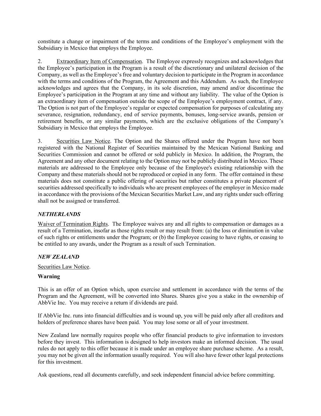 constitute a change or impairment of the terms and conditions of the Employee’s employment with the Subsidiary in Mexico that employs the Employee. 2. Extraordinary Item of Compensation. The Employee expressly recognizes and acknowledges that the Employee’s participation in the Program is a result of the discretionary and unilateral decision of the Company, as well as the Employee’s free and voluntary decision to participate in the Program in accordance with the terms and conditions of the Program, the Agreement and this Addendum. As such, the Employee acknowledges and agrees that the Company, in its sole discretion, may amend and/or discontinue the Employee’s participation in the Program at any time and without any liability. The value of the Option is an extraordinary item of compensation outside the scope of the Employee’s employment contract, if any. The Option is not part of the Employee’s regular or expected compensation for purposes of calculating any severance, resignation, redundancy, end of service payments, bonuses, long-service awards, pension or retirement benefits, or any similar payments, which are the exclusive obligations of the Company’s Subsidiary in Mexico that employs the Employee. 3. Securities Law Notice. The Option and the Shares offered under the Program have not been registered with the National Register of Securities maintained by the Mexican National Banking and Securities Commission and cannot be offered or sold publicly in Mexico. In addition, the Program, the Agreement and any other document relating to the Option may not be publicly distributed in Mexico. These materials are addressed to the Employee only because of the Employee's existing relationship with the Company and these materials should not be reproduced or copied in any form. The offer contained in these materials does not constitute a public offering of securities but rather constitutes a private placement of securities addressed specifically to individuals who are present employees of the employer in Mexico made in accordance with the provisions of the Mexican Securities Market Law, and any rights under such offering shall not be assigned or transferred. NETHERLANDS Waiver of Termination Rights. The Employee waives any and all rights to compensation or damages as a result of a Termination, insofar as those rights result or may result from: (a) the loss or diminution in value of such rights or entitlements under the Program; or (b) the Employee ceasing to have rights, or ceasing to be entitled to any awards, under the Program as a result of such Termination. NEW ZEALAND Securities Law Notice. Warning This is an offer of an Option which, upon exercise and settlement in accordance with the terms of the Program and the Agreement, will be converted into Shares. Shares give you a stake in the ownership of AbbVie Inc. You may receive a return if dividends are paid. If AbbVie Inc. runs into financial difficulties and is wound up, you will be paid only after all creditors and holders of preference shares have been paid. You may lose some or all of your investment. New Zealand law normally requires people who offer financial products to give information to investors before they invest. This information is designed to help investors make an informed decision. The usual rules do not apply to this offer because it is made under an employee share purchase scheme. As a result, you may not be given all the information usually required. You will also have fewer other legal protections for this investment. Ask questions, read all documents carefully, and seek independent financial advice before committing.