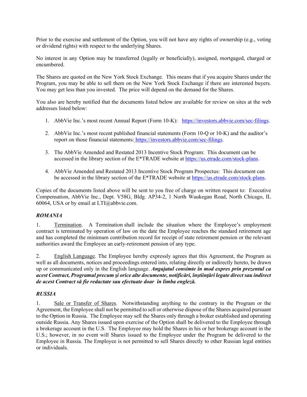 Prior to the exercise and settlement of the Option, you will not have any rights of ownership (e.g., voting or dividend rights) with respect to the underlying Shares. No interest in any Option may be transferred (legally or beneficially), assigned, mortgaged, charged or encumbered. The Shares are quoted on the New York Stock Exchange. This means that if you acquire Shares under the Program, you may be able to sell them on the New York Stock Exchange if there are interested buyers. You may get less than you invested. The price will depend on the demand for the Shares. You also are hereby notified that the documents listed below are available for review on sites at the web addresses listed below: 1. AbbVie Inc.’s most recent Annual Report (Form 10-K): https://investors.abbvie.com/sec-filings. 2. AbbVie Inc.’s most recent published financial statements (Form 10-Q or 10-K) and the auditor’s report on those financial statements: https://investors.abbvie.com/sec-filings. 3. The AbbVie Amended and Restated 2013 Incentive Stock Program: This document can be accessed in the library section of the E*TRADE website at https://us.etrade.com/stock-plans. 4. AbbVie Amended and Restated 2013 Incentive Stock Program Prospectus: This document can be accessed in the library section of the E*TRADE website at https://us.etrade.com/stock-plans. Copies of the documents listed above will be sent to you free of charge on written request to: Executive Compensation, AbbVie Inc., Dept. V58G, Bldg. AP34-2, 1 North Waukegan Road, North Chicago, IL 60064, USA or by email at [email protected]. ROMANIA 1. Termination. A Termination shall include the situation where the Employee’s employment contract is terminated by operation of law on the date the Employee reaches the standard retirement age and has completed the minimum contribution record for receipt of state retirement pension or the relevant authorities award the Employee an early-retirement pension of any type. 2. English Language. The Employee hereby expressly agrees that this Agreement, the Program as well as all documents, notices and proceedings entered into, relating directly or indirectly hereto, be drawn up or communicated only in the English language. Angajatul consimte în mod expres prin prezentul ca acest Contract, Programul precum şi orice alte documente, notificări, înştiinţări legate direct sau indirect de acest Contract să fie redactate sau efectuate doar în limba engleză. RUSSIA 1. Sale or Transfer of Shares. Notwithstanding anything to the contrary in the Program or the Agreement, the Employee shall not be permitted to sell or otherwise dispose of the Shares acquired pursuant to the Option in Russia. The Employee may sell the Shares only through a broker established and operating outside Russia. Any Shares issued upon exercise of the Option shall be delivered to the Employee through a brokerage account in the U.S. The Employee may hold the Shares in his or her brokerage account in the U.S.; however, in no event will Shares issued to the Employee under the Program be delivered to the Employee in Russia. The Employee is not permitted to sell Shares directly to other Russian legal entities or individuals.