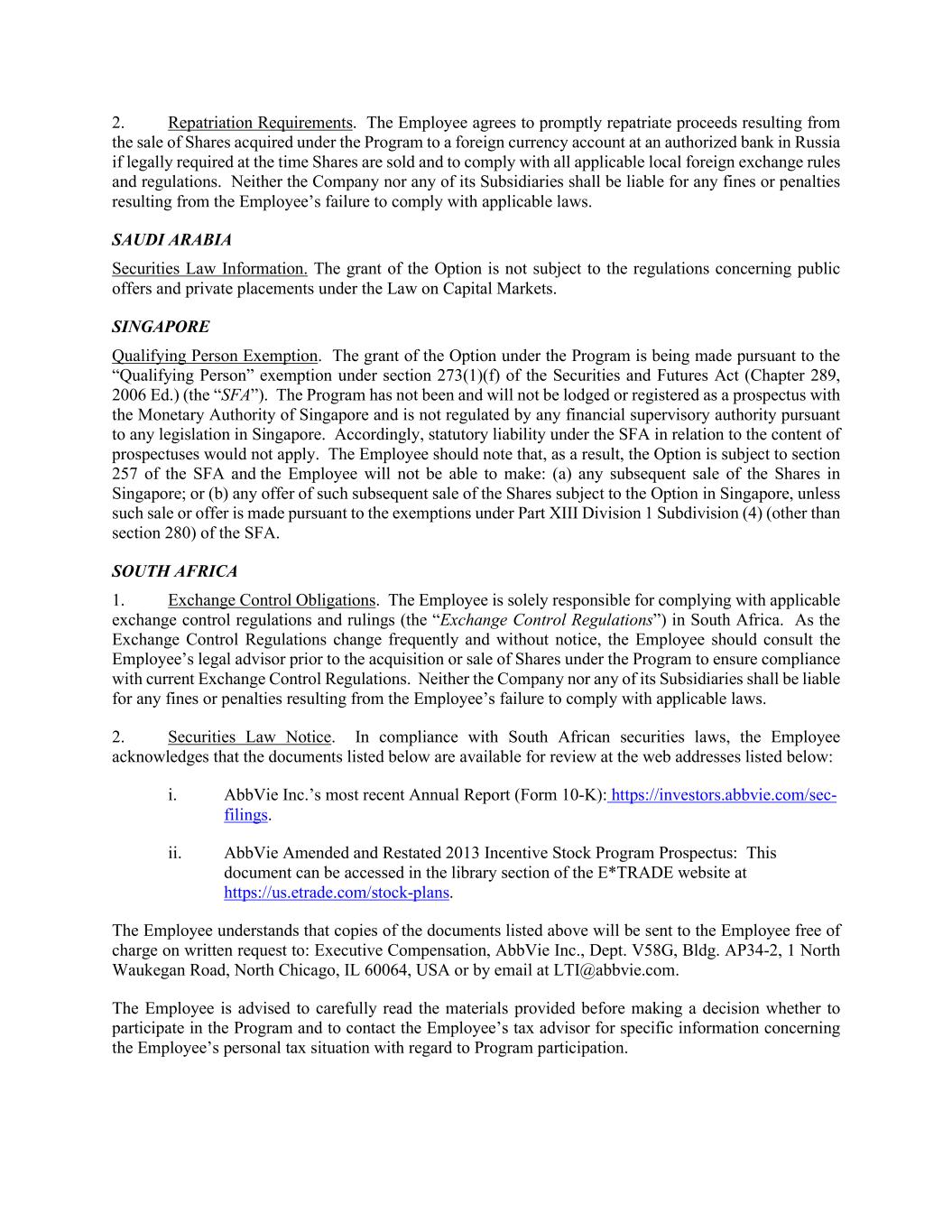 2. Repatriation Requirements. The Employee agrees to promptly repatriate proceeds resulting from the sale of Shares acquired under the Program to a foreign currency account at an authorized bank in Russia if legally required at the time Shares are sold and to comply with all applicable local foreign exchange rules and regulations. Neither the Company nor any of its Subsidiaries shall be liable for any fines or penalties resulting from the Employee’s failure to comply with applicable laws. SAUDI ARABIA Securities Law Information. The grant of the Option is not subject to the regulations concerning public offers and private placements under the Law on Capital Markets. SINGAPORE Qualifying Person Exemption. The grant of the Option under the Program is being made pursuant to the “Qualifying Person” exemption under section 273(1)(f) of the Securities and Futures Act (Chapter 289, 2006 Ed.) (the “SFA”). The Program has not been and will not be lodged or registered as a prospectus with the Monetary Authority of Singapore and is not regulated by any financial supervisory authority pursuant to any legislation in Singapore. Accordingly, statutory liability under the SFA in relation to the content of prospectuses would not apply. The Employee should note that, as a result, the Option is subject to section 257 of the SFA and the Employee will not be able to make: (a) any subsequent sale of the Shares in Singapore; or (b) any offer of such subsequent sale of the Shares subject to the Option in Singapore, unless such sale or offer is made pursuant to the exemptions under Part XIII Division 1 Subdivision (4) (other than section 280) of the SFA. SOUTH AFRICA 1. Exchange Control Obligations. The Employee is solely responsible for complying with applicable exchange control regulations and rulings (the “Exchange Control Regulations”) in South Africa. As the Exchange Control Regulations change frequently and without notice, the Employee should consult the Employee’s legal advisor prior to the acquisition or sale of Shares under the Program to ensure compliance with current Exchange Control Regulations. Neither the Company nor any of its Subsidiaries shall be liable for any fines or penalties resulting from the Employee’s failure to comply with applicable laws. 2. Securities Law Notice. In compliance with South African securities laws, the Employee acknowledges that the documents listed below are available for review at the web addresses listed below: i. AbbVie Inc.’s most recent Annual Report (Form 10-K): https://investors.abbvie.com/sec- filings. ii. AbbVie Amended and Restated 2013 Incentive Stock Program Prospectus: This document can be accessed in the library section of the E*TRADE website at https://us.etrade.com/stock-plans. The Employee understands that copies of the documents listed above will be sent to the Employee free of charge on written request to: Executive Compensation, AbbVie Inc., Dept. V58G, Bldg. AP34-2, 1 North Waukegan Road, North Chicago, IL 60064, USA or by email at [email protected]. The Employee is advised to carefully read the materials provided before making a decision whether to participate in the Program and to contact the Employee’s tax advisor for specific information concerning the Employee’s personal tax situation with regard to Program participation.