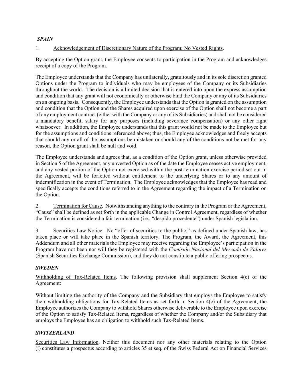 SPAIN 1. Acknowledgement of Discretionary Nature of the Program; No Vested Rights. By accepting the Option grant, the Employee consents to participation in the Program and acknowledges receipt of a copy of the Program. The Employee understands that the Company has unilaterally, gratuitously and in its sole discretion granted Options under the Program to individuals who may be employees of the Company or its Subsidiaries throughout the world. The decision is a limited decision that is entered into upon the express assumption and condition that any grant will not economically or otherwise bind the Company or any of its Subsidiaries on an ongoing basis. Consequently, the Employee understands that the Option is granted on the assumption and condition that the Option and the Shares acquired upon exercise of the Option shall not become a part of any employment contract (either with the Company or any of its Subsidiaries) and shall not be considered a mandatory benefit, salary for any purposes (including severance compensation) or any other right whatsoever. In addition, the Employee understands that this grant would not be made to the Employee but for the assumptions and conditions referenced above; thus, the Employee acknowledges and freely accepts that should any or all of the assumptions be mistaken or should any of the conditions not be met for any reason, the Option grant shall be null and void. The Employee understands and agrees that, as a condition of the Option grant, unless otherwise provided in Section 5 of the Agreement, any unvested Option as of the date the Employee ceases active employment, and any vested portion of the Option not exercised within the post-termination exercise period set out in the Agreement, will be forfeited without entitlement to the underlying Shares or to any amount of indemnification in the event of Termination. The Employee acknowledges that the Employee has read and specifically accepts the conditions referred to in the Agreement regarding the impact of a Termination on the Option. 2. Termination for Cause. Notwithstanding anything to the contrary in the Program or the Agreement, “Cause” shall be defined as set forth in the applicable Change in Control Agreement, regardless of whether the Termination is considered a fair termination (i.e., “despido procedente”) under Spanish legislation. 3. Securities Law Notice. No “offer of securities to the public,” as defined under Spanish law, has taken place or will take place in the Spanish territory. The Program, the Award, the Agreement, this Addendum and all other materials the Employee may receive regarding the Employee’s participation in the Program have not been nor will they be registered with the Comisión Nacional del Mercado de Valores (Spanish Securities Exchange Commission), and they do not constitute a public offering prospectus. SWEDEN Withholding of Tax-Related Items. The following provision shall supplement Section 4(c) of the Agreement: Without limiting the authority of the Company and the Subsidiary that employs the Employee to satisfy their withholding obligations for Tax-Related Items as set forth in Section 4(c) of the Agreement, the Employee authorizes the Company to withhold Shares otherwise deliverable to the Employee upon exercise of the Option to satisfy Tax-Related Items, regardless of whether the Company and/or the Subsidiary that employs the Employee has an obligation to withhold such Tax-Related Items. SWITZERLAND Securities Law Information. Neither this document nor any other materials relating to the Option (i) constitutes a prospectus according to articles 35 et seq. of the Swiss Federal Act on Financial Services