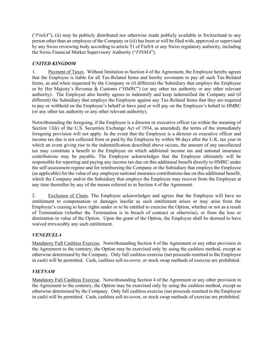 (“FinSA”), (ii) may be publicly distributed nor otherwise made publicly available in Switzerland to any person other than an employee of the Company or (iii) has been or will be filed with, approved or supervised by any Swiss reviewing body according to article 51 of FinSA or any Swiss regulatory authority, including the Swiss Financial Market Supervisory Authority (“FINMA”). UNITED KINGDOM 1. Payment of Taxes. Without limitation to Section 4 of the Agreement, the Employee hereby agrees that the Employee is liable for all Tax-Related Items and hereby covenants to pay all such Tax-Related Items, as and when requested by the Company or (if different) the Subsidiary that employs the Employee or by Her Majesty’s Revenue & Customs (“HMRC”) (or any other tax authority or any other relevant authority). The Employee also hereby agrees to indemnify and keep indemnified the Company and (if different) the Subsidiary that employs the Employee against any Tax-Related Items that they are required to pay or withhold on the Employee’s behalf or have paid or will pay on the Employee’s behalf to HMRC (or any other tax authority or any other relevant authority). Notwithstanding the foregoing, if the Employee is a director or executive officer (as within the meaning of Section 13(k) of the U.S. Securities Exchange Act of 1934, as amended), the terms of the immediately foregoing provision will not apply. In the event that the Employee is a director or executive officer and income tax due is not collected from or paid by the Employee by within 90 days after the U.K. tax year in which an event giving rise to the indemnification described above occurs, the amount of any uncollected tax may constitute a benefit to the Employee on which additional income tax and national insurance contributions may be payable. The Employee acknowledges that the Employee ultimately will be responsible for reporting and paying any income tax due on this additional benefit directly to HMRC under the self-assessment regime and for reimbursing the Company or the Subsidiary that employs the Employee (as applicable) for the value of any employee national insurance contributions due on this additional benefit, which the Company and/or the Subsidiary that employs the Employee may recover from the Employee at any time thereafter by any of the means referred to in Section 4 of the Agreement. 2. Exclusion of Claim. The Employee acknowledges and agrees that the Employee will have no entitlement to compensation or damages insofar as such entitlement arises or may arise from the Employee’s ceasing to have rights under or to be entitled to exercise the Option, whether or not as a result of Termination (whether the Termination is in breach of contract or otherwise), or from the loss or diminution in value of the Option. Upon the grant of the Option, the Employee shall be deemed to have waived irrevocably any such entitlement. VENEZUELA Mandatory Full Cashless Exercise. Notwithstanding Section 4 of the Agreement or any other provision in the Agreement to the contrary, the Option may be exercised only by using the cashless method, except as otherwise determined by the Company. Only full cashless exercise (net proceeds remitted to the Employee in cash) will be permitted. Cash, cashless sell-to-cover, or stock swap methods of exercise are prohibited. VIETNAM Mandatory Full Cashless Exercise. Notwithstanding Section 4 of the Agreement or any other provision in the Agreement to the contrary, the Option may be exercised only by using the cashless method, except as otherwise determined by the Company. Only full cashless exercise (net proceeds remitted to the Employee in cash) will be permitted. Cash, cashless sell-to-cover, or stock swap methods of exercise are prohibited.