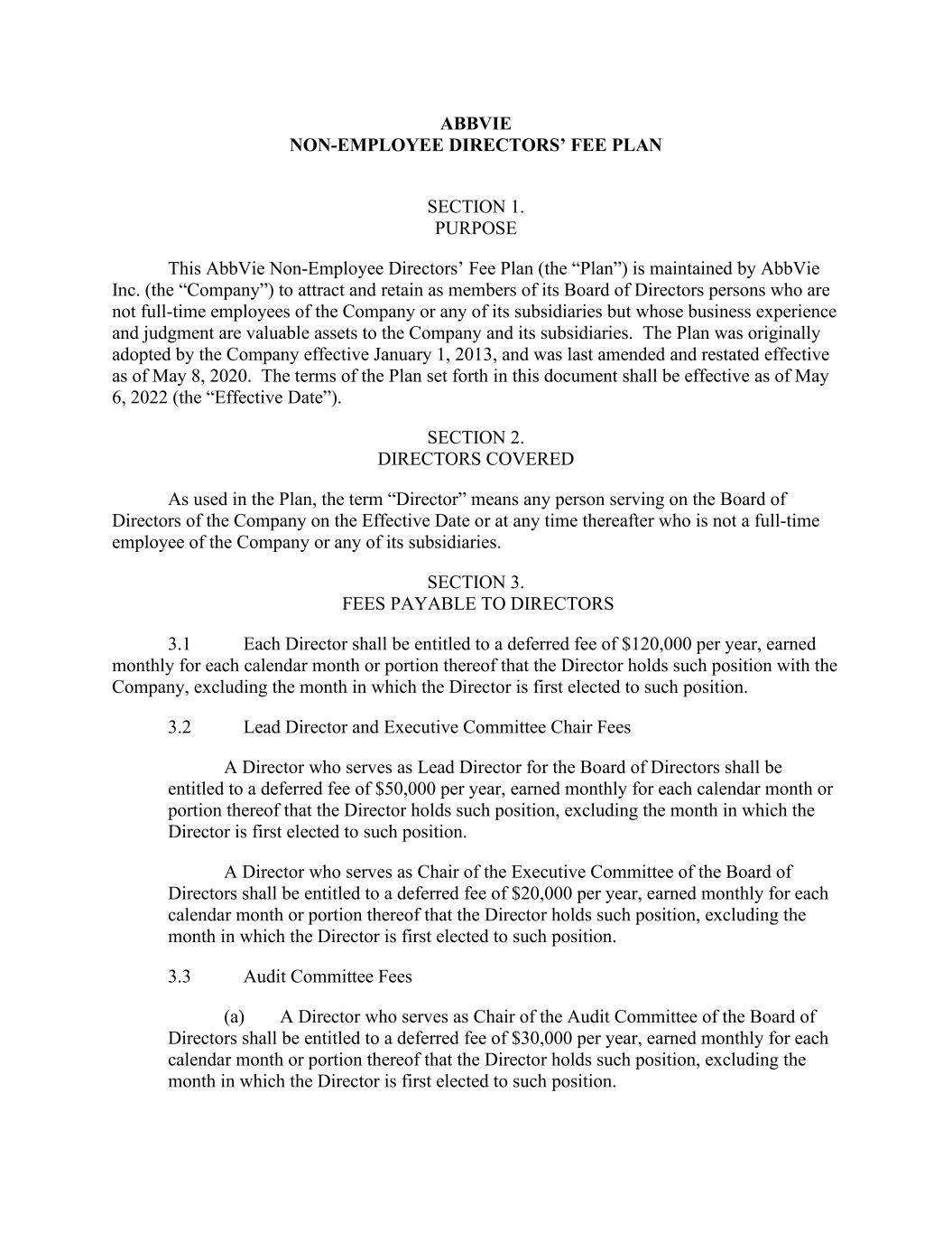 ABBVIE NON-EMPLOYEE DIRECTORS’ FEE PLAN SECTION 1. PURPOSE This AbbVie Non-Employee Directors’ Fee Plan (the “Plan”) is maintained by AbbVie Inc. (the “Company”) to attract and retain as members of its Board of Directors persons who are not full-time employees of the Company or any of its subsidiaries but whose business experience and judgment are valuable assets to the Company and its subsidiaries. The Plan was originally adopted by the Company effective January 1, 2013, and was last amended and restated effective as of May 8, 2020. The terms of the Plan set forth in this document shall be effective as of May 6, 2022 (the “Effective Date”). SECTION 2. DIRECTORS COVERED As used in the Plan, the term “Director” means any person serving on the Board of Directors of the Company on the Effective Date or at any time thereafter who is not a full-time employee of the Company or any of its subsidiaries. SECTION 3. FEES PAYABLE TO DIRECTORS 3.1 Each Director shall be entitled to a deferred fee of $120,000 per year, earned monthly for each calendar month or portion thereof that the Director holds such position with the Company, excluding the month in which the Director is first elected to such position. 3.2 Lead Director and Executive Committee Chair Fees A Director who serves as Lead Director for the Board of Directors shall be entitled to a deferred fee of $50,000 per year, earned monthly for each calendar month or portion thereof that the Director holds such position, excluding the month in which the Director is first elected to such position. A Director who serves as Chair of the Executive Committee of the Board of Directors shall be entitled to a deferred fee of $20,000 per year, earned monthly for each calendar month or portion thereof that the Director holds such position, excluding the month in which the Director is first elected to such position. 3.3 Audit Committee Fees (a) A Director who serves as Chair of the Audit Committee of the Board of Directors shall be entitled to a deferred fee of $30,000 per year, earned monthly for each calendar month or portion thereof that the Director holds such position, excluding the month in which the Director is first elected to such position.