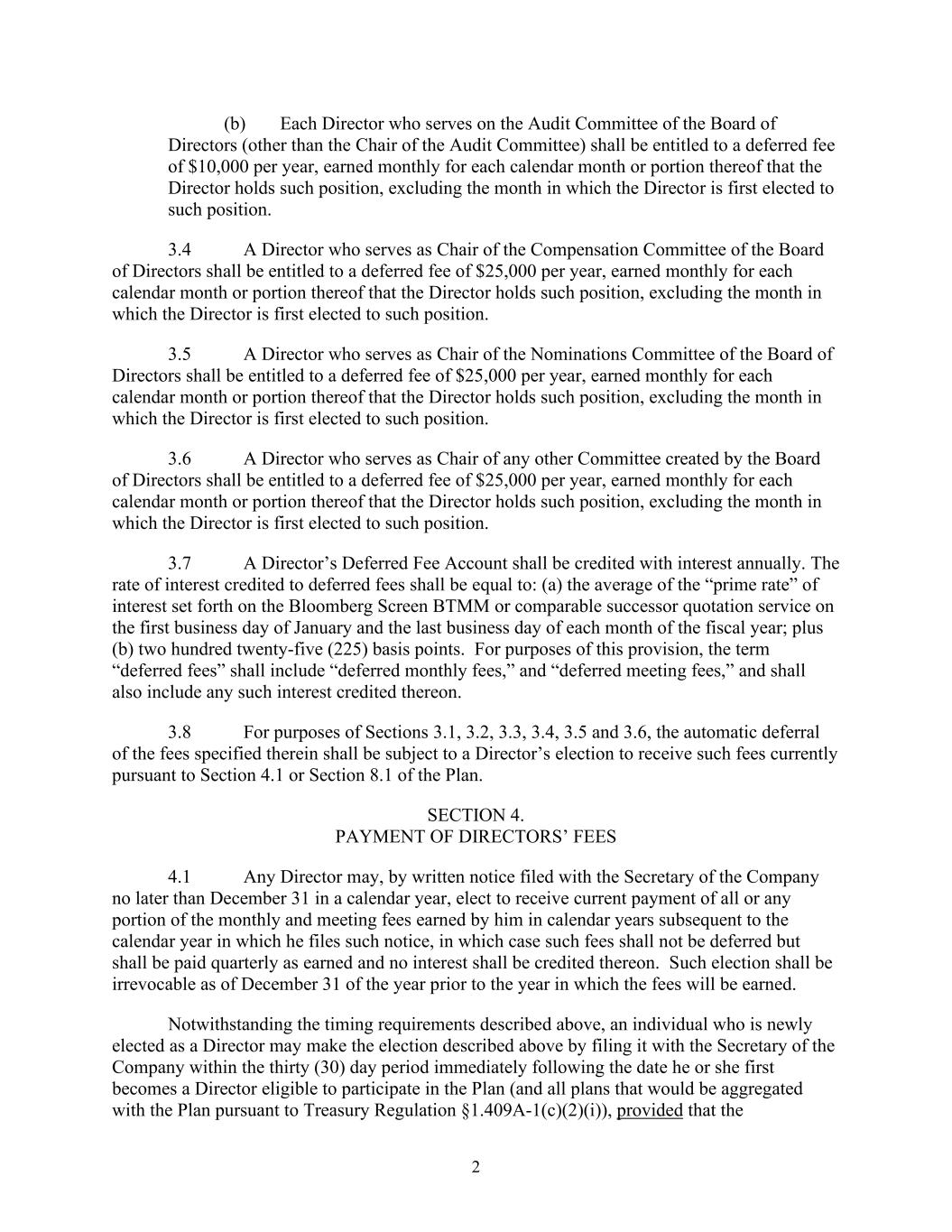 2 (b) Each Director who serves on the Audit Committee of the Board of Directors (other than the Chair of the Audit Committee) shall be entitled to a deferred fee of $10,000 per year, earned monthly for each calendar month or portion thereof that the Director holds such position, excluding the month in which the Director is first elected to such position. 3.4 A Director who serves as Chair of the Compensation Committee of the Board of Directors shall be entitled to a deferred fee of $25,000 per year, earned monthly for each calendar month or portion thereof that the Director holds such position, excluding the month in which the Director is first elected to such position. 3.5 A Director who serves as Chair of the Nominations Committee of the Board of Directors shall be entitled to a deferred fee of $25,000 per year, earned monthly for each calendar month or portion thereof that the Director holds such position, excluding the month in which the Director is first elected to such position. 3.6 A Director who serves as Chair of any other Committee created by the Board of Directors shall be entitled to a deferred fee of $25,000 per year, earned monthly for each calendar month or portion thereof that the Director holds such position, excluding the month in which the Director is first elected to such position. 3.7 A Director’s Deferred Fee Account shall be credited with interest annually. The rate of interest credited to deferred fees shall be equal to: (a) the average of the “prime rate” of interest set forth on the Bloomberg Screen BTMM or comparable successor quotation service on the first business day of January and the last business day of each month of the fiscal year; plus (b) two hundred twenty-five (225) basis points. For purposes of this provision, the term “deferred fees” shall include “deferred monthly fees,” and “deferred meeting fees,” and shall also include any such interest credited thereon. 3.8 For purposes of Sections 3.1, 3.2, 3.3, 3.4, 3.5 and 3.6, the automatic deferral of the fees specified therein shall be subject to a Director’s election to receive such fees currently pursuant to Section 4.1 or Section 8.1 of the Plan. SECTION 4. PAYMENT OF DIRECTORS’ FEES 4.1 Any Director may, by written notice filed with the Secretary of the Company no later than December 31 in a calendar year, elect to receive current payment of all or any portion of the monthly and meeting fees earned by him in calendar years subsequent to the calendar year in which he files such notice, in which case such fees shall not be deferred but shall be paid quarterly as earned and no interest shall be credited thereon. Such election shall be irrevocable as of December 31 of the year prior to the year in which the fees will be earned. Notwithstanding the timing requirements described above, an individual who is newly elected as a Director may make the election described above by filing it with the Secretary of the Company within the thirty (30) day period immediately following the date he or she first becomes a Director eligible to participate in the Plan (and all plans that would be aggregated with the Plan pursuant to Treasury Regulation §1.409A-1(c)(2)(i)), provided that the