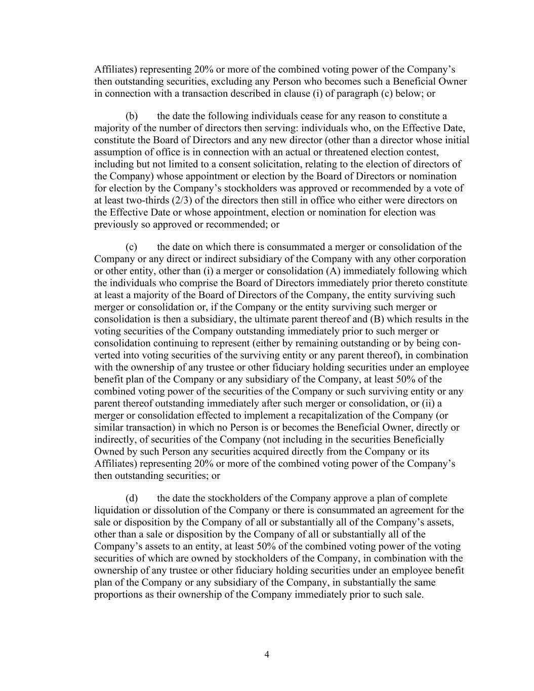 4 Affiliates) representing 20% or more of the combined voting power of the Company’s then outstanding securities, excluding any Person who becomes such a Beneficial Owner in connection with a transaction described in clause (i) of paragraph (c) below; or (b) the date the following individuals cease for any reason to constitute a majority of the number of directors then serving: individuals who, on the Effective Date, constitute the Board of Directors and any new director (other than a director whose initial assumption of office is in connection with an actual or threatened election contest, including but not limited to a consent solicitation, relating to the election of directors of the Company) whose appointment or election by the Board of Directors or nomination for election by the Company’s stockholders was approved or recommended by a vote of at least two-thirds (2/3) of the directors then still in office who either were directors on the Effective Date or whose appointment, election or nomination for election was previously so approved or recommended; or (c) the date on which there is consummated a merger or consolidation of the Company or any direct or indirect subsidiary of the Company with any other corporation or other entity, other than (i) a merger or consolidation (A) immediately following which the individuals who comprise the Board of Directors immediately prior thereto constitute at least a majority of the Board of Directors of the Company, the entity surviving such merger or consolidation or, if the Company or the entity surviving such merger or consolidation is then a subsidiary, the ultimate parent thereof and (B) which results in the voting securities of the Company outstanding immediately prior to such merger or consolidation continuing to represent (either by remaining outstanding or by being con- verted into voting securities of the surviving entity or any parent thereof), in combination with the ownership of any trustee or other fiduciary holding securities under an employee benefit plan of the Company or any subsidiary of the Company, at least 50% of the combined voting power of the securities of the Company or such surviving entity or any parent thereof outstanding immediately after such merger or consolidation, or (ii) a merger or consolidation effected to implement a recapitalization of the Company (or similar transaction) in which no Person is or becomes the Beneficial Owner, directly or indirectly, of securities of the Company (not including in the securities Beneficially Owned by such Person any securities acquired directly from the Company or its Affiliates) representing 20% or more of the combined voting power of the Company’s then outstanding securities; or (d) the date the stockholders of the Company approve a plan of complete liquidation or dissolution of the Company or there is consummated an agreement for the sale or disposition by the Company of all or substantially all of the Company’s assets, other than a sale or disposition by the Company of all or substantially all of the Company’s assets to an entity, at least 50% of the combined voting power of the voting securities of which are owned by stockholders of the Company, in combination with the ownership of any trustee or other fiduciary holding securities under an employee benefit plan of the Company or any subsidiary of the Company, in substantially the same proportions as their ownership of the Company immediately prior to such sale.