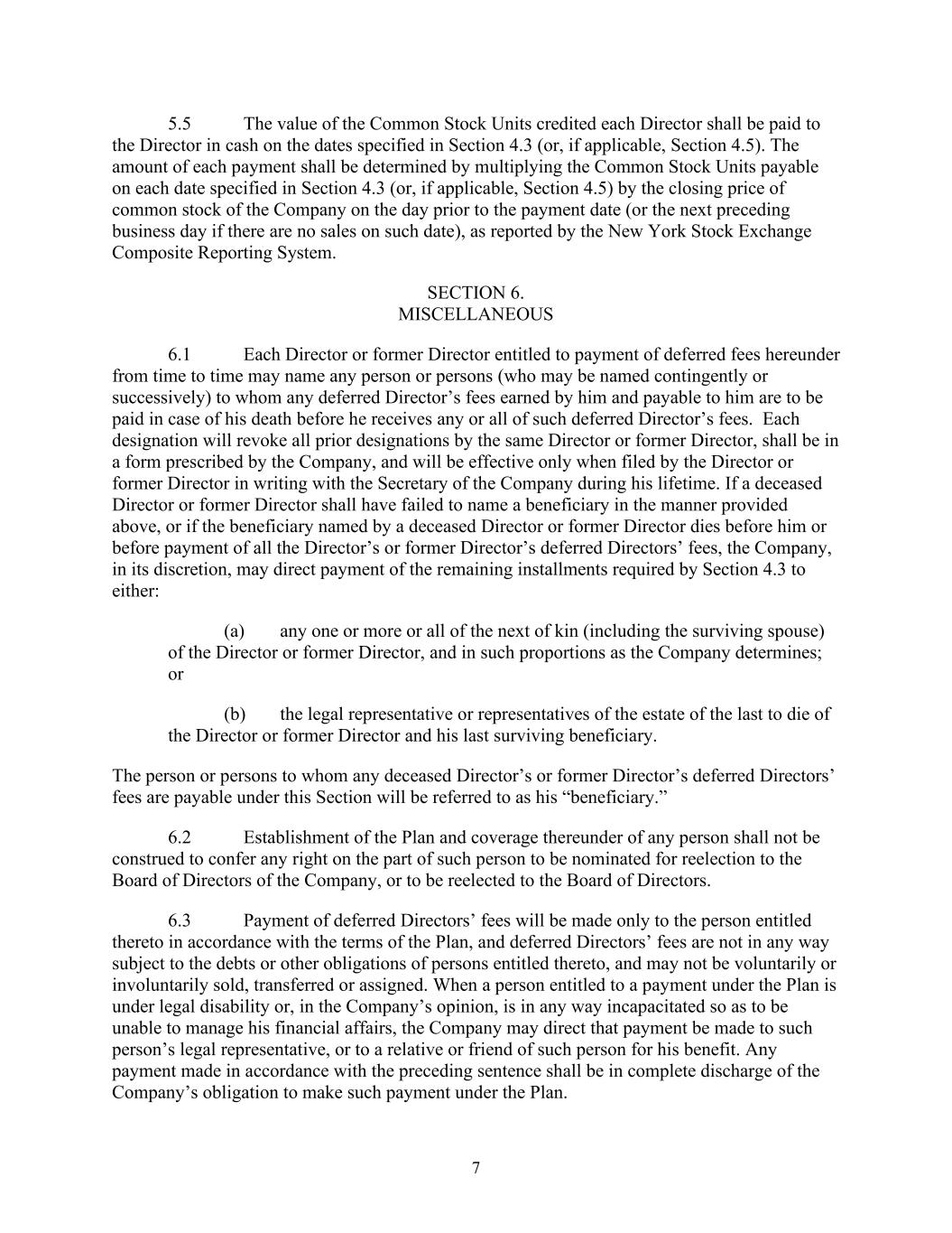 7 5.5 The value of the Common Stock Units credited each Director shall be paid to the Director in cash on the dates specified in Section 4.3 (or, if applicable, Section 4.5). The amount of each payment shall be determined by multiplying the Common Stock Units payable on each date specified in Section 4.3 (or, if applicable, Section 4.5) by the closing price of common stock of the Company on the day prior to the payment date (or the next preceding business day if there are no sales on such date), as reported by the New York Stock Exchange Composite Reporting System. SECTION 6. MISCELLANEOUS 6.1 Each Director or former Director entitled to payment of deferred fees hereunder from time to time may name any person or persons (who may be named contingently or successively) to whom any deferred Director’s fees earned by him and payable to him are to be paid in case of his death before he receives any or all of such deferred Director’s fees. Each designation will revoke all prior designations by the same Director or former Director, shall be in a form prescribed by the Company, and will be effective only when filed by the Director or former Director in writing with the Secretary of the Company during his lifetime. If a deceased Director or former Director shall have failed to name a beneficiary in the manner provided above, or if the beneficiary named by a deceased Director or former Director dies before him or before payment of all the Director’s or former Director’s deferred Directors’ fees, the Company, in its discretion, may direct payment of the remaining installments required by Section 4.3 to either: (a) any one or more or all of the next of kin (including the surviving spouse) of the Director or former Director, and in such proportions as the Company determines; or (b) the legal representative or representatives of the estate of the last to die of the Director or former Director and his last surviving beneficiary. The person or persons to whom any deceased Director’s or former Director’s deferred Directors’ fees are payable under this Section will be referred to as his “beneficiary.” 6.2 Establishment of the Plan and coverage thereunder of any person shall not be construed to confer any right on the part of such person to be nominated for reelection to the Board of Directors of the Company, or to be reelected to the Board of Directors. 6.3 Payment of deferred Directors’ fees will be made only to the person entitled thereto in accordance with the terms of the Plan, and deferred Directors’ fees are not in any way subject to the debts or other obligations of persons entitled thereto, and may not be voluntarily or involuntarily sold, transferred or assigned. When a person entitled to a payment under the Plan is under legal disability or, in the Company’s opinion, is in any way incapacitated so as to be unable to manage his financial affairs, the Company may direct that payment be made to such person’s legal representative, or to a relative or friend of such person for his benefit. Any payment made in accordance with the preceding sentence shall be in complete discharge of the Company’s obligation to make such payment under the Plan.
