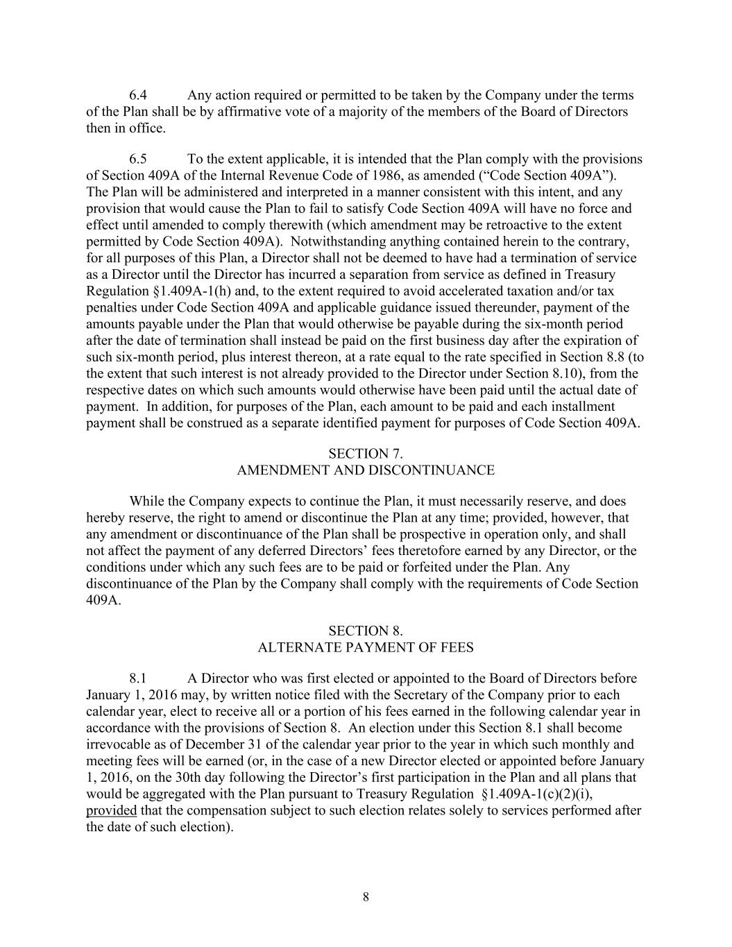 8 6.4 Any action required or permitted to be taken by the Company under the terms of the Plan shall be by affirmative vote of a majority of the members of the Board of Directors then in office. 6.5 To the extent applicable, it is intended that the Plan comply with the provisions of Section 409A of the Internal Revenue Code of 1986, as amended (“Code Section 409A”). The Plan will be administered and interpreted in a manner consistent with this intent, and any provision that would cause the Plan to fail to satisfy Code Section 409A will have no force and effect until amended to comply therewith (which amendment may be retroactive to the extent permitted by Code Section 409A). Notwithstanding anything contained herein to the contrary, for all purposes of this Plan, a Director shall not be deemed to have had a termination of service as a Director until the Director has incurred a separation from service as defined in Treasury Regulation §1.409A-1(h) and, to the extent required to avoid accelerated taxation and/or tax penalties under Code Section 409A and applicable guidance issued thereunder, payment of the amounts payable under the Plan that would otherwise be payable during the six-month period after the date of termination shall instead be paid on the first business day after the expiration of such six-month period, plus interest thereon, at a rate equal to the rate specified in Section 8.8 (to the extent that such interest is not already provided to the Director under Section 8.10), from the respective dates on which such amounts would otherwise have been paid until the actual date of payment. In addition, for purposes of the Plan, each amount to be paid and each installment payment shall be construed as a separate identified payment for purposes of Code Section 409A. SECTION 7. AMENDMENT AND DISCONTINUANCE While the Company expects to continue the Plan, it must necessarily reserve, and does hereby reserve, the right to amend or discontinue the Plan at any time; provided, however, that any amendment or discontinuance of the Plan shall be prospective in operation only, and shall not affect the payment of any deferred Directors’ fees theretofore earned by any Director, or the conditions under which any such fees are to be paid or forfeited under the Plan. Any discontinuance of the Plan by the Company shall comply with the requirements of Code Section 409A. SECTION 8. ALTERNATE PAYMENT OF FEES 8.1 A Director who was first elected or appointed to the Board of Directors before January 1, 2016 may, by written notice filed with the Secretary of the Company prior to each calendar year, elect to receive all or a portion of his fees earned in the following calendar year in accordance with the provisions of Section 8. An election under this Section 8.1 shall become irrevocable as of December 31 of the calendar year prior to the year in which such monthly and meeting fees will be earned (or, in the case of a new Director elected or appointed before January 1, 2016, on the 30th day following the Director’s first participation in the Plan and all plans that would be aggregated with the Plan pursuant to Treasury Regulation §1.409A-1(c)(2)(i), provided that the compensation subject to such election relates solely to services performed after the date of such election).