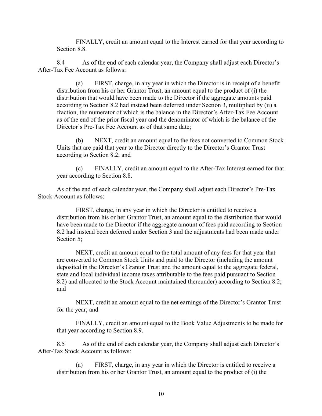 10 FINALLY, credit an amount equal to the Interest earned for that year according to Section 8.8. 8.4 As of the end of each calendar year, the Company shall adjust each Director’s After-Tax Fee Account as follows: (a) FIRST, charge, in any year in which the Director is in receipt of a benefit distribution from his or her Grantor Trust, an amount equal to the product of (i) the distribution that would have been made to the Director if the aggregate amounts paid according to Section 8.2 had instead been deferred under Section 3, multiplied by (ii) a fraction, the numerator of which is the balance in the Director’s After-Tax Fee Account as of the end of the prior fiscal year and the denominator of which is the balance of the Director’s Pre-Tax Fee Account as of that same date; (b) NEXT, credit an amount equal to the fees not converted to Common Stock Units that are paid that year to the Director directly to the Director’s Grantor Trust according to Section 8.2; and (c) FINALLY, credit an amount equal to the After-Tax Interest earned for that year according to Section 8.8. As of the end of each calendar year, the Company shall adjust each Director’s Pre-Tax Stock Account as follows: FIRST, charge, in any year in which the Director is entitled to receive a distribution from his or her Grantor Trust, an amount equal to the distribution that would have been made to the Director if the aggregate amount of fees paid according to Section 8.2 had instead been deferred under Section 3 and the adjustments had been made under Section 5; NEXT, credit an amount equal to the total amount of any fees for that year that are converted to Common Stock Units and paid to the Director (including the amount deposited in the Director’s Grantor Trust and the amount equal to the aggregate federal, state and local individual income taxes attributable to the fees paid pursuant to Section 8.2) and allocated to the Stock Account maintained thereunder) according to Section 8.2; and NEXT, credit an amount equal to the net earnings of the Director’s Grantor Trust for the year; and FINALLY, credit an amount equal to the Book Value Adjustments to be made for that year according to Section 8.9. 8.5 As of the end of each calendar year, the Company shall adjust each Director’s After-Tax Stock Account as follows: (a) FIRST, charge, in any year in which the Director is entitled to receive a distribution from his or her Grantor Trust, an amount equal to the product of (i) the