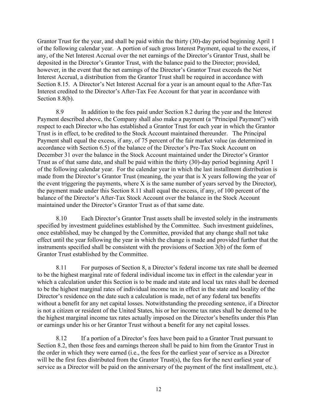 12 Grantor Trust for the year, and shall be paid within the thirty (30)-day period beginning April 1 of the following calendar year. A portion of such gross Interest Payment, equal to the excess, if any, of the Net Interest Accrual over the net earnings of the Director’s Grantor Trust, shall be deposited in the Director’s Grantor Trust, with the balance paid to the Director; provided, however, in the event that the net earnings of the Director’s Grantor Trust exceeds the Net Interest Accrual, a distribution from the Grantor Trust shall be required in accordance with Section 8.15. A Director’s Net Interest Accrual for a year is an amount equal to the After-Tax Interest credited to the Director’s After-Tax Fee Account for that year in accordance with Section 8.8(b). 8.9 In addition to the fees paid under Section 8.2 during the year and the Interest Payment described above, the Company shall also make a payment (a “Principal Payment”) with respect to each Director who has established a Grantor Trust for each year in which the Grantor Trust is in effect, to be credited to the Stock Account maintained thereunder. The Principal Payment shall equal the excess, if any, of 75 percent of the fair market value (as determined in accordance with Section 6.5) of the balance of the Director’s Pre-Tax Stock Account on December 31 over the balance in the Stock Account maintained under the Director’s Grantor Trust as of that same date, and shall be paid within the thirty (30)-day period beginning April 1 of the following calendar year. For the calendar year in which the last installment distribution is made from the Director’s Grantor Trust (meaning, the year that is X years following the year of the event triggering the payments, where X is the same number of years served by the Director), the payment made under this Section 8.11 shall equal the excess, if any, of 100 percent of the balance of the Director’s After-Tax Stock Account over the balance in the Stock Account maintained under the Director’s Grantor Trust as of that same date. 8.10 Each Director’s Grantor Trust assets shall be invested solely in the instruments specified by investment guidelines established by the Committee. Such investment guidelines, once established, may be changed by the Committee, provided that any change shall not take effect until the year following the year in which the change is made and provided further that the instruments specified shall be consistent with the provisions of Section 3(b) of the form of Grantor Trust established by the Committee. 8.11 For purposes of Section 8, a Director’s federal income tax rate shall be deemed to be the highest marginal rate of federal individual income tax in effect in the calendar year in which a calculation under this Section is to be made and state and local tax rates shall be deemed to be the highest marginal rates of individual income tax in effect in the state and locality of the Director’s residence on the date such a calculation is made, net of any federal tax benefits without a benefit for any net capital losses. Notwithstanding the preceding sentence, if a Director is not a citizen or resident of the United States, his or her income tax rates shall be deemed to be the highest marginal income tax rates actually imposed on the Director’s benefits under this Plan or earnings under his or her Grantor Trust without a benefit for any net capital losses. 8.12 If a portion of a Director’s fees have been paid to a Grantor Trust pursuant to Section 8.2, then those fees and earnings thereon shall be paid to him from the Grantor Trust in the order in which they were earned (i.e., the fees for the earliest year of service as a Director will be the first fees distributed from the Grantor Trust(s), the fees for the next earliest year of service as a Director will be paid on the anniversary of the payment of the first installment, etc.).