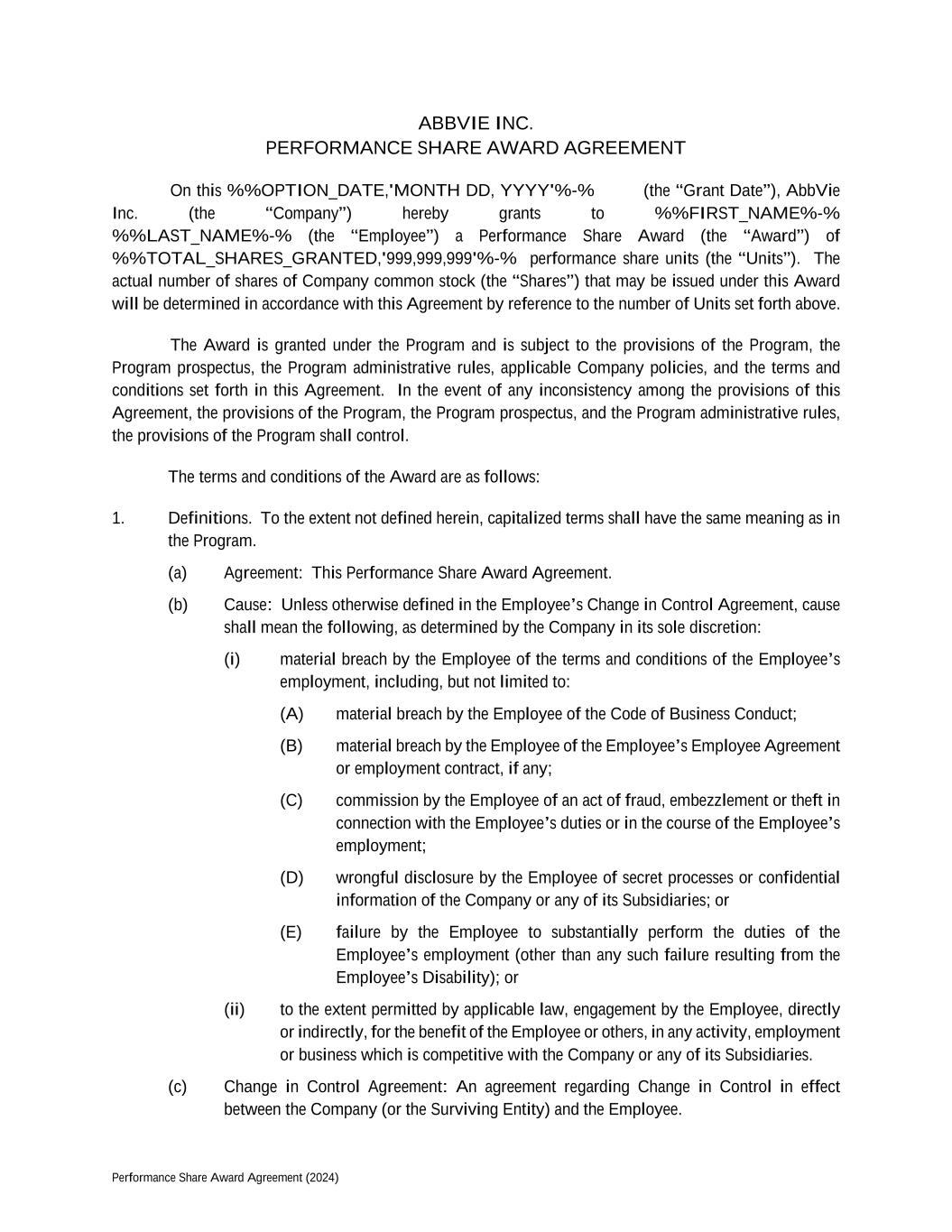 Performance Share Award Agreement (2024) ABBVIE INC. PERFORMANCE SHARE AWARD AGREEMENT On this %%OPTION_DATE,'MONTH DD, YYYY'%-% (the “Grant Date”), AbbVie Inc. (the “Company”) hereby grants to %%FIRST_NAME%-% %%LAST_NAME%-% (the “Employee”) a Performance Share Award (the “Award”) of %%TOTAL_SHARES_GRANTED,'999,999,999'%-% performance share units (the “Units”). The actual number of shares of Company common stock (the “Shares”) that may be issued under this Award will be determined in accordance with this Agreement by reference to the number of Units set forth above. The Award is granted under the Program and is subject to the provisions of the Program, the Program prospectus, the Program administrative rules, applicable Company policies, and the terms and conditions set forth in this Agreement. In the event of any inconsistency among the provisions of this Agreement, the provisions of the Program, the Program prospectus, and the Program administrative rules, the provisions of the Program shall control. The terms and conditions of the Award are as follows: 1. Definitions. To the extent not defined herein, capitalized terms shall have the same meaning as in the Program. (a) Agreement: This Performance Share Award Agreement. (b) Cause: Unless otherwise defined in the Employee’s Change in Control Agreement, cause shall mean the following, as determined by the Company in its sole discretion: (i) material breach by the Employee of the terms and conditions of the Employee’s employment, including, but not limited to: (A) material breach by the Employee of the Code of Business Conduct; (B) material breach by the Employee of the Employee’s Employee Agreement or employment contract, if any; (C) commission by the Employee of an act of fraud, embezzlement or theft in connection with the Employee’s duties or in the course of the Employee’s employment; (D) wrongful disclosure by the Employee of secret processes or confidential information of the Company or any of its Subsidiaries; or (E) failure by the Employee to substantially perform the duties of the Employee’s employment (other than any such failure resulting from the Employee’s Disability); or (ii) to the extent permitted by applicable law, engagement by the Employee, directly or indirectly, for the benefit of the Employee or others, in any activity, employment or business which is competitive with the Company or any of its Subsidiaries. (c) Change in Control Agreement: An agreement regarding Change in Control in effect between the Company (or the Surviving Entity) and the Employee.