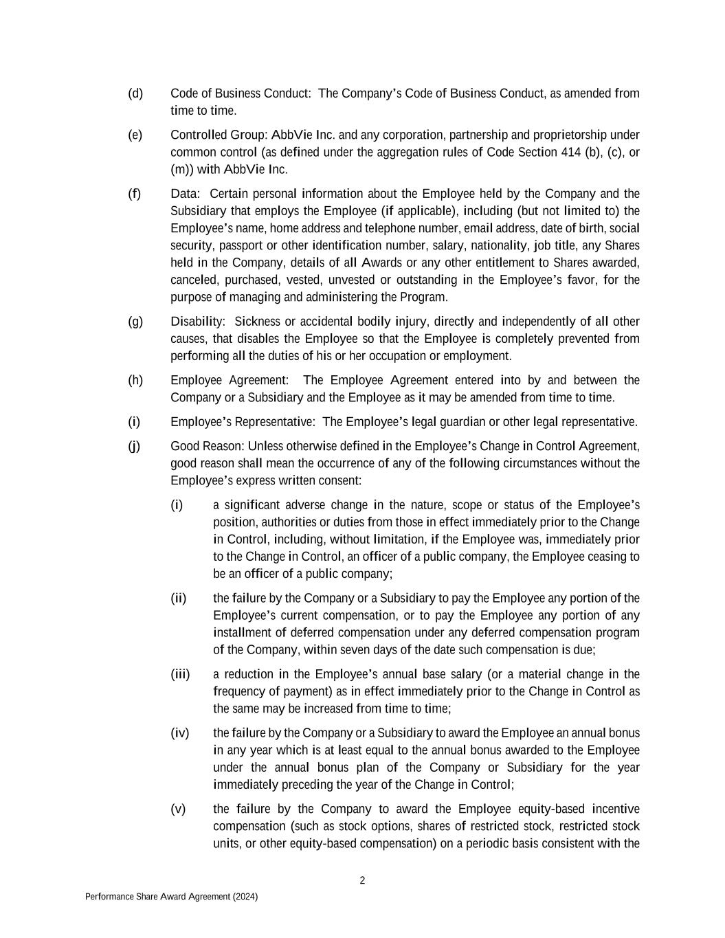 2 Performance Share Award Agreement (2024) (d) Code of Business Conduct: The Company’s Code of Business Conduct, as amended from time to time. (e) Controlled Group: AbbVie Inc. and any corporation, partnership and proprietorship under common control (as defined under the aggregation rules of Code Section 414 (b), (c), or (m)) with AbbVie Inc. (f) Data: Certain personal information about the Employee held by the Company and the Subsidiary that employs the Employee (if applicable), including (but not limited to) the Employee’s name, home address and telephone number, email address, date of birth, social security, passport or other identification number, salary, nationality, job title, any Shares held in the Company, details of all Awards or any other entitlement to Shares awarded, canceled, purchased, vested, unvested or outstanding in the Employee’s favor, for the purpose of managing and administering the Program. (g) Disability: Sickness or accidental bodily injury, directly and independently of all other causes, that disables the Employee so that the Employee is completely prevented from performing all the duties of his or her occupation or employment. (h) Employee Agreement: The Employee Agreement entered into by and between the Company or a Subsidiary and the Employee as it may be amended from time to time. (i) Employee’s Representative: The Employee’s legal guardian or other legal representative. (j) Good Reason: Unless otherwise defined in the Employee’s Change in Control Agreement, good reason shall mean the occurrence of any of the following circumstances without the Employee’s express written consent: (i) a significant adverse change in the nature, scope or status of the Employee’s position, authorities or duties from those in effect immediately prior to the Change in Control, including, without limitation, if the Employee was, immediately prior to the Change in Control, an officer of a public company, the Employee ceasing to be an officer of a public company; (ii) the failure by the Company or a Subsidiary to pay the Employee any portion of the Employee’s current compensation, or to pay the Employee any portion of any installment of deferred compensation under any deferred compensation program of the Company, within seven days of the date such compensation is due; (iii) a reduction in the Employee’s annual base salary (or a material change in the frequency of payment) as in effect immediately prior to the Change in Control as the same may be increased from time to time; (iv) the failure by the Company or a Subsidiary to award the Employee an annual bonus in any year which is at least equal to the annual bonus awarded to the Employee under the annual bonus plan of the Company or Subsidiary for the year immediately preceding the year of the Change in Control; (v) the failure by the Company to award the Employee equity-based incentive compensation (such as stock options, shares of restricted stock, restricted stock units, or other equity-based compensation) on a periodic basis consistent with the
