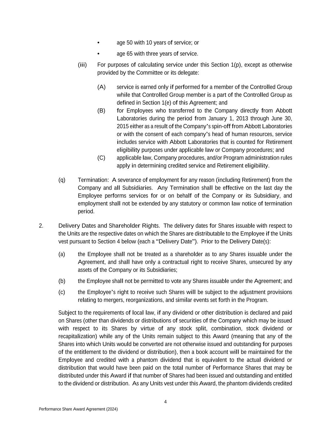 4 Performance Share Award Agreement (2024) • age 50 with 10 years of service; or • age 65 with three years of service. (iii) For purposes of calculating service under this Section 1(p), except as otherwise provided by the Committee or its delegate: (A) service is earned only if performed for a member of the Controlled Group while that Controlled Group member is a part of the Controlled Group as defined in Section 1(e) of this Agreement; and (B) for Employees who transferred to the Company directly from Abbott Laboratories during the period from January 1, 2013 through June 30, 2015 either as a result of the Company’s spin-off from Abbott Laboratories or with the consent of each company’s head of human resources, service includes service with Abbott Laboratories that is counted for Retirement eligibility purposes under applicable law or Company procedures; and (C) applicable law, Company procedures, and/or Program administration rules apply in determining credited service and Retirement eligibility. (q) Termination: A severance of employment for any reason (including Retirement) from the Company and all Subsidiaries. Any Termination shall be effective on the last day the Employee performs services for or on behalf of the Company or its Subsidiary, and employment shall not be extended by any statutory or common law notice of termination period. 2. Delivery Dates and Shareholder Rights. The delivery dates for Shares issuable with respect to the Units are the respective dates on which the Shares are distributable to the Employee if the Units vest pursuant to Section 4 below (each a “Delivery Date”). Prior to the Delivery Date(s): (a) the Employee shall not be treated as a shareholder as to any Shares issuable under the Agreement, and shall have only a contractual right to receive Shares, unsecured by any assets of the Company or its Subsidiaries; (b) the Employee shall not be permitted to vote any Shares issuable under the Agreement; and (c) the Employee’s right to receive such Shares will be subject to the adjustment provisions relating to mergers, reorganizations, and similar events set forth in the Program. Subject to the requirements of local law, if any dividend or other distribution is declared and paid on Shares (other than dividends or distributions of securities of the Company which may be issued with respect to its Shares by virtue of any stock split, combination, stock dividend or recapitalization) while any of the Units remain subject to this Award (meaning that any of the Shares into which Units would be converted are not otherwise issued and outstanding for purposes of the entitlement to the dividend or distribution), then a book account will be maintained for the Employee and credited with a phantom dividend that is equivalent to the actual dividend or distribution that would have been paid on the total number of Performance Shares that may be distributed under this Award if that number of Shares had been issued and outstanding and entitled to the dividend or distribution. As any Units vest under this Award, the phantom dividends credited