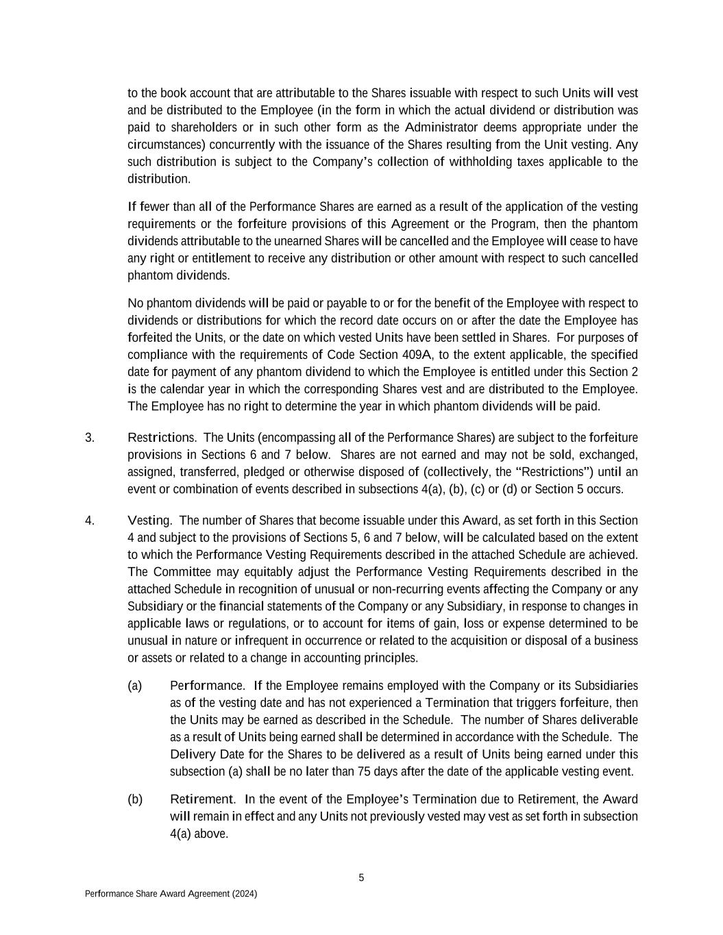 5 Performance Share Award Agreement (2024) to the book account that are attributable to the Shares issuable with respect to such Units will vest and be distributed to the Employee (in the form in which the actual dividend or distribution was paid to shareholders or in such other form as the Administrator deems appropriate under the circumstances) concurrently with the issuance of the Shares resulting from the Unit vesting. Any such distribution is subject to the Company’s collection of withholding taxes applicable to the distribution. If fewer than all of the Performance Shares are earned as a result of the application of the vesting requirements or the forfeiture provisions of this Agreement or the Program, then the phantom dividends attributable to the unearned Shares will be cancelled and the Employee will cease to have any right or entitlement to receive any distribution or other amount with respect to such cancelled phantom dividends. No phantom dividends will be paid or payable to or for the benefit of the Employee with respect to dividends or distributions for which the record date occurs on or after the date the Employee has forfeited the Units, or the date on which vested Units have been settled in Shares. For purposes of compliance with the requirements of Code Section 409A, to the extent applicable, the specified date for payment of any phantom dividend to which the Employee is entitled under this Section 2 is the calendar year in which the corresponding Shares vest and are distributed to the Employee. The Employee has no right to determine the year in which phantom dividends will be paid. 3. Restrictions. The Units (encompassing all of the Performance Shares) are subject to the forfeiture provisions in Sections 6 and 7 below. Shares are not earned and may not be sold, exchanged, assigned, transferred, pledged or otherwise disposed of (collectively, the “Restrictions”) until an event or combination of events described in subsections 4(a), (b), (c) or (d) or Section 5 occurs. 4. Vesting. The number of Shares that become issuable under this Award, as set forth in this Section 4 and subject to the provisions of Sections 5, 6 and 7 below, will be calculated based on the extent to which the Performance Vesting Requirements described in the attached Schedule are achieved. The Committee may equitably adjust the Performance Vesting Requirements described in the attached Schedule in recognition of unusual or non-recurring events affecting the Company or any Subsidiary or the financial statements of the Company or any Subsidiary, in response to changes in applicable laws or regulations, or to account for items of gain, loss or expense determined to be unusual in nature or infrequent in occurrence or related to the acquisition or disposal of a business or assets or related to a change in accounting principles. (a) Performance. If the Employee remains employed with the Company or its Subsidiaries as of the vesting date and has not experienced a Termination that triggers forfeiture, then the Units may be earned as described in the Schedule. The number of Shares deliverable as a result of Units being earned shall be determined in accordance with the Schedule. The Delivery Date for the Shares to be delivered as a result of Units being earned under this subsection (a) shall be no later than 75 days after the date of the applicable vesting event. (b) Retirement. In the event of the Employee’s Termination due to Retirement, the Award will remain in effect and any Units not previously vested may vest as set forth in subsection 4(a) above.