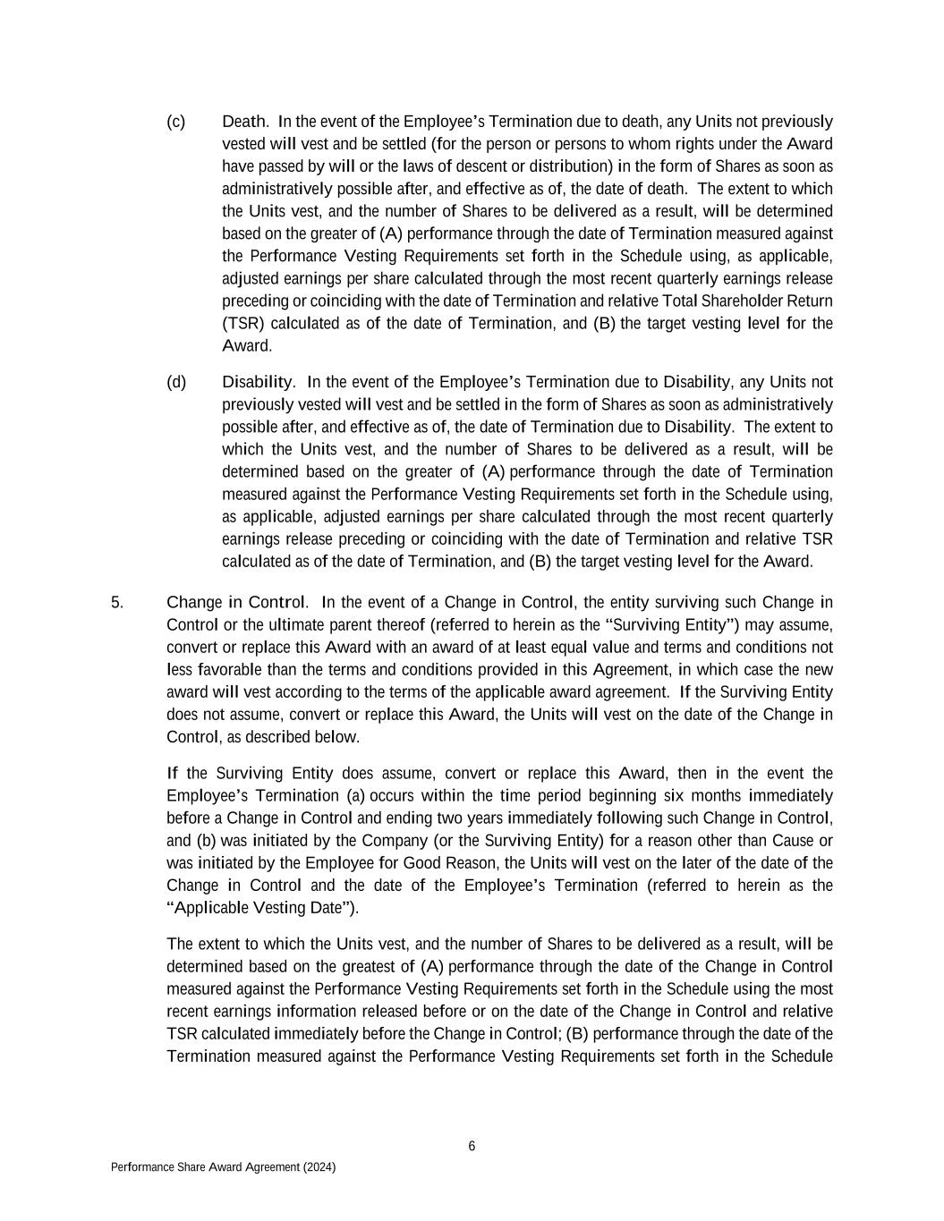 6 Performance Share Award Agreement (2024) (c) Death. In the event of the Employee’s Termination due to death, any Units not previously vested will vest and be settled (for the person or persons to whom rights under the Award have passed by will or the laws of descent or distribution) in the form of Shares as soon as administratively possible after, and effective as of, the date of death. The extent to which the Units vest, and the number of Shares to be delivered as a result, will be determined based on the greater of (A) performance through the date of Termination measured against the Performance Vesting Requirements set forth in the Schedule using, as applicable, adjusted earnings per share calculated through the most recent quarterly earnings release preceding or coinciding with the date of Termination and relative Total Shareholder Return (TSR) calculated as of the date of Termination, and (B) the target vesting level for the Award. (d) Disability. In the event of the Employee’s Termination due to Disability, any Units not previously vested will vest and be settled in the form of Shares as soon as administratively possible after, and effective as of, the date of Termination due to Disability. The extent to which the Units vest, and the number of Shares to be delivered as a result, will be determined based on the greater of (A) performance through the date of Termination measured against the Performance Vesting Requirements set forth in the Schedule using, as applicable, adjusted earnings per share calculated through the most recent quarterly earnings release preceding or coinciding with the date of Termination and relative TSR calculated as of the date of Termination, and (B) the target vesting level for the Award. 5. Change in Control. In the event of a Change in Control, the entity surviving such Change in Control or the ultimate parent thereof (referred to herein as the “Surviving Entity”) may assume, convert or replace this Award with an award of at least equal value and terms and conditions not less favorable than the terms and conditions provided in this Agreement, in which case the new award will vest according to the terms of the applicable award agreement. If the Surviving Entity does not assume, convert or replace this Award, the Units will vest on the date of the Change in Control, as described below. If the Surviving Entity does assume, convert or replace this Award, then in the event the Employee’s Termination (a) occurs within the time period beginning six months immediately before a Change in Control and ending two years immediately following such Change in Control, and (b) was initiated by the Company (or the Surviving Entity) for a reason other than Cause or was initiated by the Employee for Good Reason, the Units will vest on the later of the date of the Change in Control and the date of the Employee’s Termination (referred to herein as the “Applicable Vesting Date”). The extent to which the Units vest, and the number of Shares to be delivered as a result, will be determined based on the greatest of (A) performance through the date of the Change in Control measured against the Performance Vesting Requirements set forth in the Schedule using the most recent earnings information released before or on the date of the Change in Control and relative TSR calculated immediately before the Change in Control; (B) performance through the date of the Termination measured against the Performance Vesting Requirements set forth in the Schedule