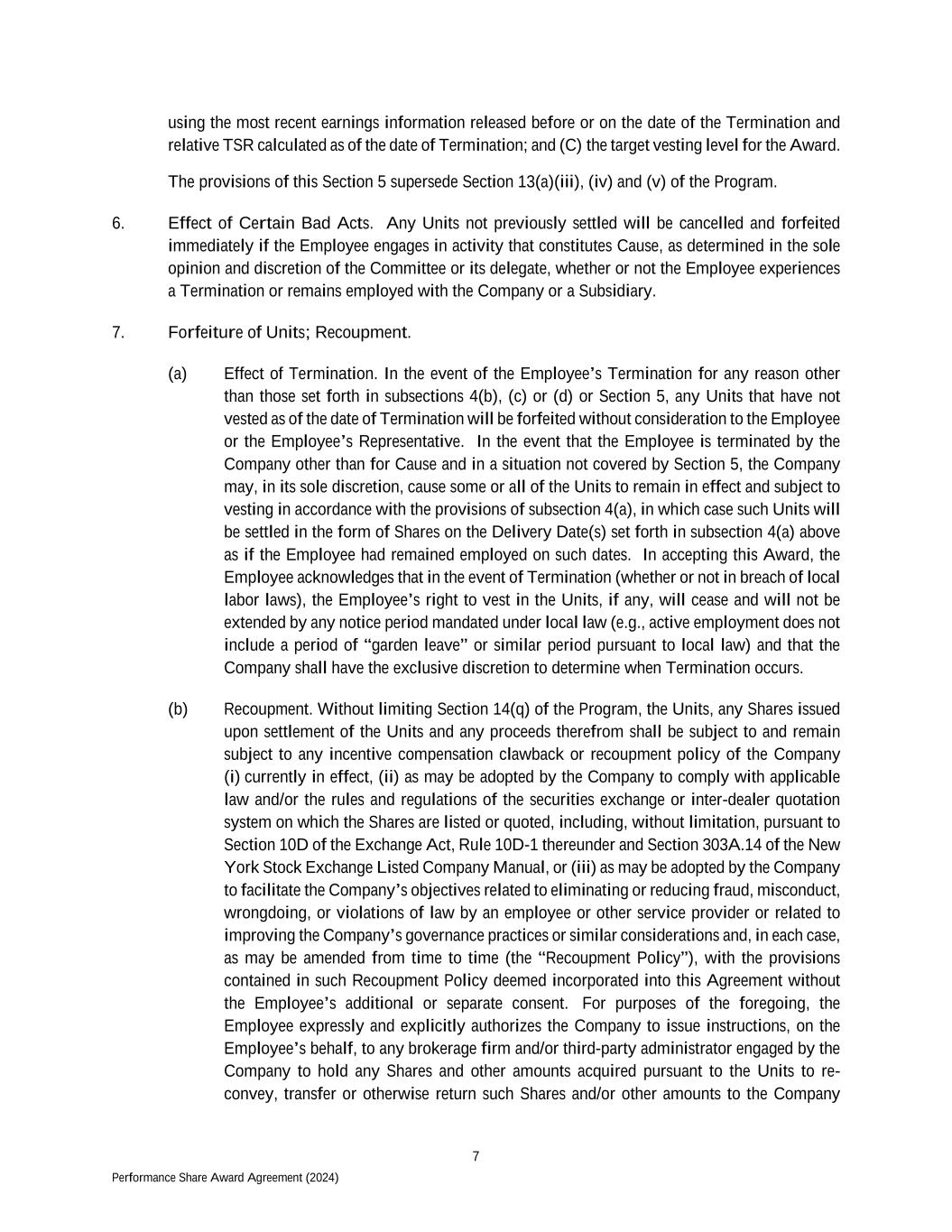 7 Performance Share Award Agreement (2024) using the most recent earnings information released before or on the date of the Termination and relative TSR calculated as of the date of Termination; and (C) the target vesting level for the Award. The provisions of this Section 5 supersede Section 13(a)(iii), (iv) and (v) of the Program. 6. Effect of Certain Bad Acts. Any Units not previously settled will be cancelled and forfeited immediately if the Employee engages in activity that constitutes Cause, as determined in the sole opinion and discretion of the Committee or its delegate, whether or not the Employee experiences a Termination or remains employed with the Company or a Subsidiary. 7. Forfeiture of Units; Recoupment. (a) Effect of Termination. In the event of the Employee’s Termination for any reason other than those set forth in subsections 4(b), (c) or (d) or Section 5, any Units that have not vested as of the date of Termination will be forfeited without consideration to the Employee or the Employee’s Representative. In the event that the Employee is terminated by the Company other than for Cause and in a situation not covered by Section 5, the Company may, in its sole discretion, cause some or all of the Units to remain in effect and subject to vesting in accordance with the provisions of subsection 4(a), in which case such Units will be settled in the form of Shares on the Delivery Date(s) set forth in subsection 4(a) above as if the Employee had remained employed on such dates. In accepting this Award, the Employee acknowledges that in the event of Termination (whether or not in breach of local labor laws), the Employee’s right to vest in the Units, if any, will cease and will not be extended by any notice period mandated under local law (e.g., active employment does not include a period of “garden leave” or similar period pursuant to local law) and that the Company shall have the exclusive discretion to determine when Termination occurs. (b) Recoupment. Without limiting Section 14(q) of the Program, the Units, any Shares issued upon settlement of the Units and any proceeds therefrom shall be subject to and remain subject to any incentive compensation clawback or recoupment policy of the Company (i) currently in effect, (ii) as may be adopted by the Company to comply with applicable law and/or the rules and regulations of the securities exchange or inter-dealer quotation system on which the Shares are listed or quoted, including, without limitation, pursuant to Section 10D of the Exchange Act, Rule 10D-1 thereunder and Section 303A.14 of the New York Stock Exchange Listed Company Manual, or (iii) as may be adopted by the Company to facilitate the Company’s objectives related to eliminating or reducing fraud, misconduct, wrongdoing, or violations of law by an employee or other service provider or related to improving the Company’s governance practices or similar considerations and, in each case, as may be amended from time to time (the “Recoupment Policy”), with the provisions contained in such Recoupment Policy deemed incorporated into this Agreement without the Employee’s additional or separate consent. For purposes of the foregoing, the Employee expressly and explicitly authorizes the Company to issue instructions, on the Employee’s behalf, to any brokerage firm and/or third-party administrator engaged by the Company to hold any Shares and other amounts acquired pursuant to the Units to re- convey, transfer or otherwise return such Shares and/or other amounts to the Company