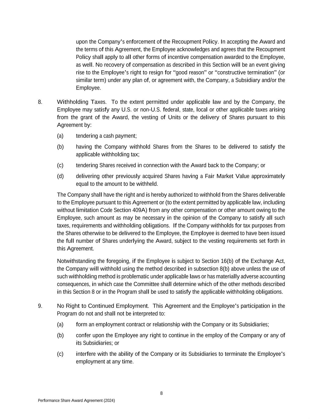 8 Performance Share Award Agreement (2024) upon the Company’s enforcement of the Recoupment Policy. In accepting the Award and the terms of this Agreement, the Employee acknowledges and agrees that the Recoupment Policy shall apply to all other forms of incentive compensation awarded to the Employee, as well. No recovery of compensation as described in this Section will be an event giving rise to the Employee’s right to resign for “good reason” or “constructive termination” (or similar term) under any plan of, or agreement with, the Company, a Subsidiary and/or the Employee. 8. Withholding Taxes. To the extent permitted under applicable law and by the Company, the Employee may satisfy any U.S. or non-U.S. federal, state, local or other applicable taxes arising from the grant of the Award, the vesting of Units or the delivery of Shares pursuant to this Agreement by: (a) tendering a cash payment; (b) having the Company withhold Shares from the Shares to be delivered to satisfy the applicable withholding tax; (c) tendering Shares received in connection with the Award back to the Company; or (d) delivering other previously acquired Shares having a Fair Market Value approximately equal to the amount to be withheld. The Company shall have the right and is hereby authorized to withhold from the Shares deliverable to the Employee pursuant to this Agreement or (to the extent permitted by applicable law, including without limitation Code Section 409A) from any other compensation or other amount owing to the Employee, such amount as may be necessary in the opinion of the Company to satisfy all such taxes, requirements and withholding obligations. If the Company withholds for tax purposes from the Shares otherwise to be delivered to the Employee, the Employee is deemed to have been issued the full number of Shares underlying the Award, subject to the vesting requirements set forth in this Agreement. Notwithstanding the foregoing, if the Employee is subject to Section 16(b) of the Exchange Act, the Company will withhold using the method described in subsection 8(b) above unless the use of such withholding method is problematic under applicable laws or has materially adverse accounting consequences, in which case the Committee shall determine which of the other methods described in this Section 8 or in the Program shall be used to satisfy the applicable withholding obligations. 9. No Right to Continued Employment. This Agreement and the Employee’s participation in the Program do not and shall not be interpreted to: (a) form an employment contract or relationship with the Company or its Subsidiaries; (b) confer upon the Employee any right to continue in the employ of the Company or any of its Subsidiaries; or (c) interfere with the ability of the Company or its Subsidiaries to terminate the Employee’s employment at any time.