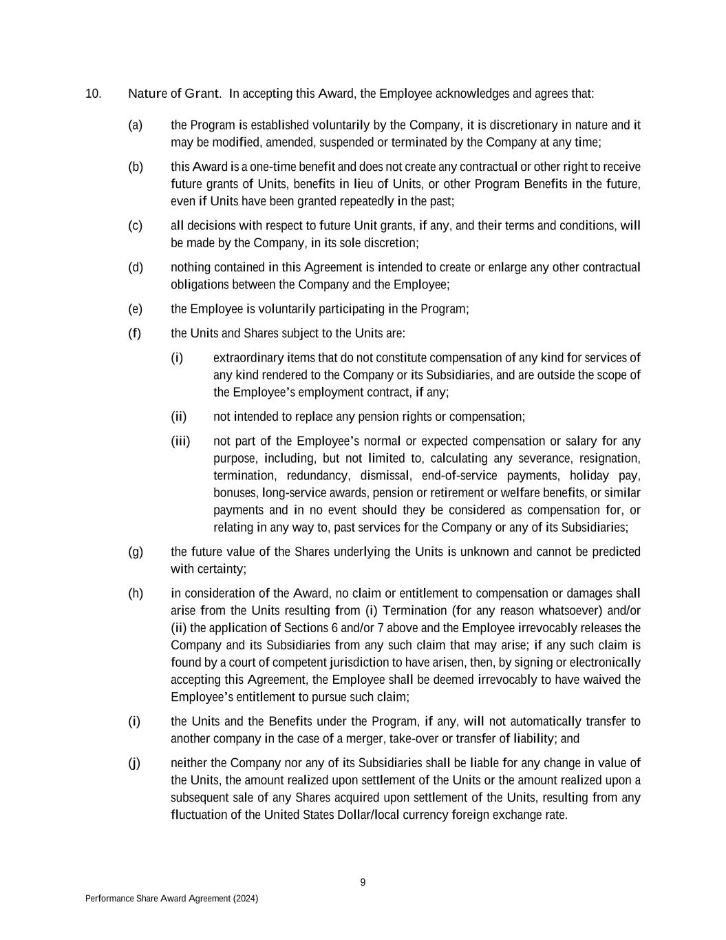 9 Performance Share Award Agreement (2024) 10. Nature of Grant. In accepting this Award, the Employee acknowledges and agrees that: (a) the Program is established voluntarily by the Company, it is discretionary in nature and it may be modified, amended, suspended or terminated by the Company at any time; (b) this Award is a one-time benefit and does not create any contractual or other right to receive future grants of Units, benefits in lieu of Units, or other Program Benefits in the future, even if Units have been granted repeatedly in the past; (c) all decisions with respect to future Unit grants, if any, and their terms and conditions, will be made by the Company, in its sole discretion; (d) nothing contained in this Agreement is intended to create or enlarge any other contractual obligations between the Company and the Employee; (e) the Employee is voluntarily participating in the Program; (f) the Units and Shares subject to the Units are: (i) extraordinary items that do not constitute compensation of any kind for services of any kind rendered to the Company or its Subsidiaries, and are outside the scope of the Employee’s employment contract, if any; (ii) not intended to replace any pension rights or compensation; (iii) not part of the Employee’s normal or expected compensation or salary for any purpose, including, but not limited to, calculating any severance, resignation, termination, redundancy, dismissal, end-of-service payments, holiday pay, bonuses, long-service awards, pension or retirement or welfare benefits, or similar payments and in no event should they be considered as compensation for, or relating in any way to, past services for the Company or any of its Subsidiaries; (g) the future value of the Shares underlying the Units is unknown and cannot be predicted with certainty; (h) in consideration of the Award, no claim or entitlement to compensation or damages shall arise from the Units resulting from (i) Termination (for any reason whatsoever) and/or (ii) the application of Sections 6 and/or 7 above and the Employee irrevocably releases the Company and its Subsidiaries from any such claim that may arise; if any such claim is found by a court of competent jurisdiction to have arisen, then, by signing or electronically accepting this Agreement, the Employee shall be deemed irrevocably to have waived the Employee’s entitlement to pursue such claim; (i) the Units and the Benefits under the Program, if any, will not automatically transfer to another company in the case of a merger, take-over or transfer of liability; and (j) neither the Company nor any of its Subsidiaries shall be liable for any change in value of the Units, the amount realized upon settlement of the Units or the amount realized upon a subsequent sale of any Shares acquired upon settlement of the Units, resulting from any fluctuation of the United States Dollar/local currency foreign exchange rate.