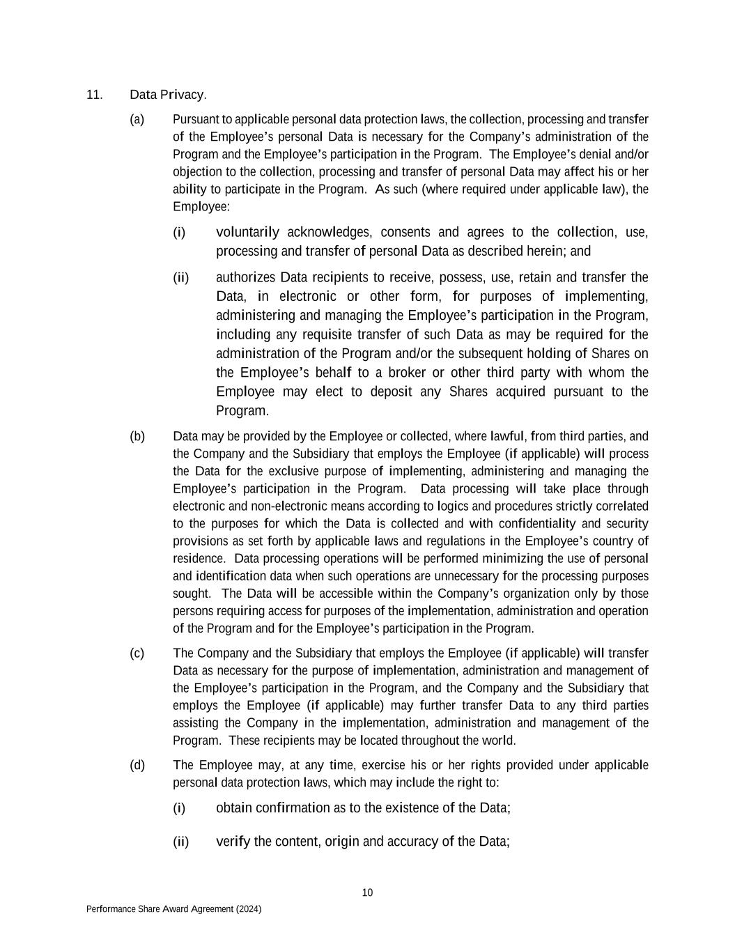 10 Performance Share Award Agreement (2024) 11. Data Privacy. (a) Pursuant to applicable personal data protection laws, the collection, processing and transfer of the Employee’s personal Data is necessary for the Company’s administration of the Program and the Employee’s participation in the Program. The Employee’s denial and/or objection to the collection, processing and transfer of personal Data may affect his or her ability to participate in the Program. As such (where required under applicable law), the Employee: (i) voluntarily acknowledges, consents and agrees to the collection, use, processing and transfer of personal Data as described herein; and (ii) authorizes Data recipients to receive, possess, use, retain and transfer the Data, in electronic or other form, for purposes of implementing, administering and managing the Employee’s participation in the Program, including any requisite transfer of such Data as may be required for the administration of the Program and/or the subsequent holding of Shares on the Employee’s behalf to a broker or other third party with whom the Employee may elect to deposit any Shares acquired pursuant to the Program. (b) Data may be provided by the Employee or collected, where lawful, from third parties, and the Company and the Subsidiary that employs the Employee (if applicable) will process the Data for the exclusive purpose of implementing, administering and managing the Employee’s participation in the Program. Data processing will take place through electronic and non-electronic means according to logics and procedures strictly correlated to the purposes for which the Data is collected and with confidentiality and security provisions as set forth by applicable laws and regulations in the Employee’s country of residence. Data processing operations will be performed minimizing the use of personal and identification data when such operations are unnecessary for the processing purposes sought. The Data will be accessible within the Company’s organization only by those persons requiring access for purposes of the implementation, administration and operation of the Program and for the Employee’s participation in the Program. (c) The Company and the Subsidiary that employs the Employee (if applicable) will transfer Data as necessary for the purpose of implementation, administration and management of the Employee’s participation in the Program, and the Company and the Subsidiary that employs the Employee (if applicable) may further transfer Data to any third parties assisting the Company in the implementation, administration and management of the Program. These recipients may be located throughout the world. (d) The Employee may, at any time, exercise his or her rights provided under applicable personal data protection laws, which may include the right to: (i) obtain confirmation as to the existence of the Data; (ii) verify the content, origin and accuracy of the Data;