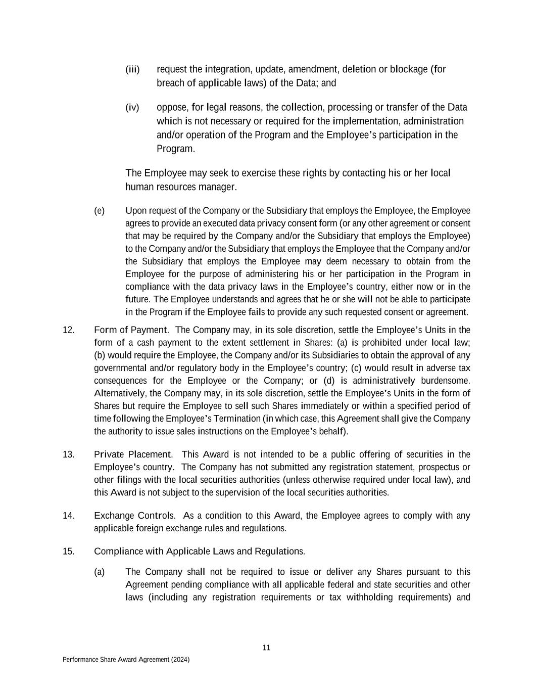 11 Performance Share Award Agreement (2024) (iii) request the integration, update, amendment, deletion or blockage (for breach of applicable laws) of the Data; and (iv) oppose, for legal reasons, the collection, processing or transfer of the Data which is not necessary or required for the implementation, administration and/or operation of the Program and the Employee’s participation in the Program. The Employee may seek to exercise these rights by contacting his or her local human resources manager. (e) Upon request of the Company or the Subsidiary that employs the Employee, the Employee agrees to provide an executed data privacy consent form (or any other agreement or consent that may be required by the Company and/or the Subsidiary that employs the Employee) to the Company and/or the Subsidiary that employs the Employee that the Company and/or the Subsidiary that employs the Employee may deem necessary to obtain from the Employee for the purpose of administering his or her participation in the Program in compliance with the data privacy laws in the Employee’s country, either now or in the future. The Employee understands and agrees that he or she will not be able to participate in the Program if the Employee fails to provide any such requested consent or agreement. 12. Form of Payment. The Company may, in its sole discretion, settle the Employee’s Units in the form of a cash payment to the extent settlement in Shares: (a) is prohibited under local law; (b) would require the Employee, the Company and/or its Subsidiaries to obtain the approval of any governmental and/or regulatory body in the Employee’s country; (c) would result in adverse tax consequences for the Employee or the Company; or (d) is administratively burdensome. Alternatively, the Company may, in its sole discretion, settle the Employee’s Units in the form of Shares but require the Employee to sell such Shares immediately or within a specified period of time following the Employee’s Termination (in which case, this Agreement shall give the Company the authority to issue sales instructions on the Employee’s behalf). 13. Private Placement. This Award is not intended to be a public offering of securities in the Employee’s country. The Company has not submitted any registration statement, prospectus or other filings with the local securities authorities (unless otherwise required under local law), and this Award is not subject to the supervision of the local securities authorities. 14. Exchange Controls. As a condition to this Award, the Employee agrees to comply with any applicable foreign exchange rules and regulations. 15. Compliance with Applicable Laws and Regulations. (a) The Company shall not be required to issue or deliver any Shares pursuant to this Agreement pending compliance with all applicable federal and state securities and other laws (including any registration requirements or tax withholding requirements) and