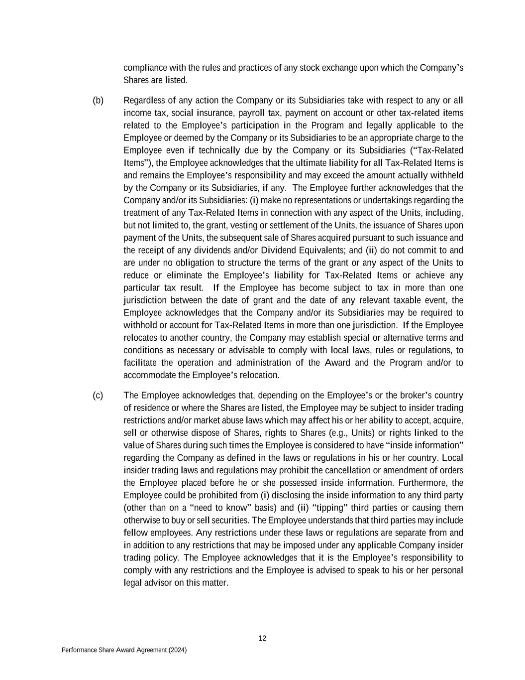 12 Performance Share Award Agreement (2024) compliance with the rules and practices of any stock exchange upon which the Company’s Shares are listed. (b) Regardless of any action the Company or its Subsidiaries take with respect to any or all income tax, social insurance, payroll tax, payment on account or other tax-related items related to the Employee’s participation in the Program and legally applicable to the Employee or deemed by the Company or its Subsidiaries to be an appropriate charge to the Employee even if technically due by the Company or its Subsidiaries (“Tax-Related Items”), the Employee acknowledges that the ultimate liability for all Tax-Related Items is and remains the Employee’s responsibility and may exceed the amount actually withheld by the Company or its Subsidiaries, if any. The Employee further acknowledges that the Company and/or its Subsidiaries: (i) make no representations or undertakings regarding the treatment of any Tax-Related Items in connection with any aspect of the Units, including, but not limited to, the grant, vesting or settlement of the Units, the issuance of Shares upon payment of the Units, the subsequent sale of Shares acquired pursuant to such issuance and the receipt of any dividends and/or Dividend Equivalents; and (ii) do not commit to and are under no obligation to structure the terms of the grant or any aspect of the Units to reduce or eliminate the Employee’s liability for Tax-Related Items or achieve any particular tax result. If the Employee has become subject to tax in more than one jurisdiction between the date of grant and the date of any relevant taxable event, the Employee acknowledges that the Company and/or its Subsidiaries may be required to withhold or account for Tax-Related Items in more than one jurisdiction. If the Employee relocates to another country, the Company may establish special or alternative terms and conditions as necessary or advisable to comply with local laws, rules or regulations, to facilitate the operation and administration of the Award and the Program and/or to accommodate the Employee’s relocation. (c) The Employee acknowledges that, depending on the Employee’s or the broker’s country of residence or where the Shares are listed, the Employee may be subject to insider trading restrictions and/or market abuse laws which may affect his or her ability to accept, acquire, sell or otherwise dispose of Shares, rights to Shares (e.g., Units) or rights linked to the value of Shares during such times the Employee is considered to have “inside information” regarding the Company as defined in the laws or regulations in his or her country. Local insider trading laws and regulations may prohibit the cancellation or amendment of orders the Employee placed before he or she possessed inside information. Furthermore, the Employee could be prohibited from (i) disclosing the inside information to any third party (other than on a “need to know” basis) and (ii) “tipping” third parties or causing them otherwise to buy or sell securities. The Employee understands that third parties may include fellow employees. Any restrictions under these laws or regulations are separate from and in addition to any restrictions that may be imposed under any applicable Company insider trading policy. The Employee acknowledges that it is the Employee’s responsibility to comply with any restrictions and the Employee is advised to speak to his or her personal legal advisor on this matter.