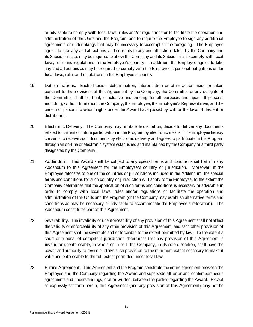 14 Performance Share Award Agreement (2024) or advisable to comply with local laws, rules and/or regulations or to facilitate the operation and administration of the Units and the Program, and to require the Employee to sign any additional agreements or undertakings that may be necessary to accomplish the foregoing. The Employee agrees to take any and all actions, and consents to any and all actions taken by the Company and its Subsidiaries, as may be required to allow the Company and its Subsidiaries to comply with local laws, rules and regulations in the Employee’s country. In addition, the Employee agrees to take any and all actions as may be required to comply with the Employee’s personal obligations under local laws, rules and regulations in the Employee’s country. 19. Determinations. Each decision, determination, interpretation or other action made or taken pursuant to the provisions of this Agreement by the Company, the Committee or any delegate of the Committee shall be final, conclusive and binding for all purposes and upon all persons, including, without limitation, the Company, the Employee, the Employee’s Representative, and the person or persons to whom rights under the Award have passed by will or the laws of descent or distribution. 20. Electronic Delivery. The Company may, in its sole discretion, decide to deliver any documents related to current or future participation in the Program by electronic means. The Employee hereby consents to receive such documents by electronic delivery and agrees to participate in the Program through an on-line or electronic system established and maintained by the Company or a third party designated by the Company. 21. Addendum. This Award shall be subject to any special terms and conditions set forth in any Addendum to this Agreement for the Employee’s country or jurisdiction. Moreover, if the Employee relocates to one of the countries or jurisdictions included in the Addendum, the special terms and conditions for such country or jurisdiction will apply to the Employee, to the extent the Company determines that the application of such terms and conditions is necessary or advisable in order to comply with local laws, rules and/or regulations or facilitate the operation and administration of the Units and the Program (or the Company may establish alternative terms and conditions as may be necessary or advisable to accommodate the Employee’s relocation). The Addendum constitutes part of this Agreement. 22. Severability. The invalidity or unenforceability of any provision of this Agreement shall not affect the validity or enforceability of any other provision of this Agreement, and each other provision of this Agreement shall be severable and enforceable to the extent permitted by law. To the extent a court or tribunal of competent jurisdiction determines that any provision of this Agreement is invalid or unenforceable, in whole or in part, the Company, in its sole discretion, shall have the power and authority to revise or strike such provision to the minimum extent necessary to make it valid and enforceable to the full extent permitted under local law. 23. Entire Agreement. This Agreement and the Program constitute the entire agreement between the Employee and the Company regarding the Award and supersede all prior and contemporaneous agreements and understandings, oral or written, between the parties regarding the Award. Except as expressly set forth herein, this Agreement (and any provision of this Agreement) may not be