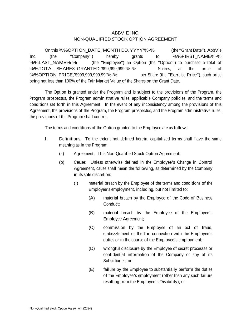 Non-Qualified Stock Option Agreement (2024) ABBVIE INC. NON-QUALIFIED STOCK OPTION AGREEMENT On this %%OPTION_DATE,'MONTH DD, YYYY'%-% (the “Grant Date”), AbbVie Inc. (the “Company”) hereby grants to %%FIRST_NAME%-% %%LAST_NAME%-% (the “Employee”) an Option (the “Option”) to purchase a total of %%TOTAL_SHARES_GRANTED,'999,999,999'%-% Shares, at the price of %%OPTION_PRICE,'$999,999,999.99'%-% per Share (the “Exercise Price”), such price being not less than 100% of the Fair Market Value of the Shares on the Grant Date. The Option is granted under the Program and is subject to the provisions of the Program, the Program prospectus, the Program administrative rules, applicable Company policies, and the terms and conditions set forth in this Agreement. In the event of any inconsistency among the provisions of this Agreement, the provisions of the Program, the Program prospectus, and the Program administrative rules, the provisions of the Program shall control. The terms and conditions of the Option granted to the Employee are as follows: 1. Definitions. To the extent not defined herein, capitalized terms shall have the same meaning as in the Program. (a) Agreement: This Non-Qualified Stock Option Agreement. (b) Cause: Unless otherwise defined in the Employee’s Change in Control Agreement, cause shall mean the following, as determined by the Company in its sole discretion: (i) material breach by the Employee of the terms and conditions of the Employee’s employment, including, but not limited to: (A) material breach by the Employee of the Code of Business Conduct; (B) material breach by the Employee of the Employee’s Employee Agreement; (C) commission by the Employee of an act of fraud, embezzlement or theft in connection with the Employee’s duties or in the course of the Employee’s employment; (D) wrongful disclosure by the Employee of secret processes or confidential information of the Company or any of its Subsidiaries; or (E) failure by the Employee to substantially perform the duties of the Employee’s employment (other than any such failure resulting from the Employee’s Disability); or