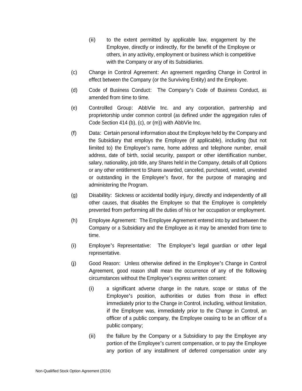 Non-Qualified Stock Option Agreement (2024) (ii) to the extent permitted by applicable law, engagement by the Employee, directly or indirectly, for the benefit of the Employee or others, in any activity, employment or business which is competitive with the Company or any of its Subsidiaries. (c) Change in Control Agreement: An agreement regarding Change in Control in effect between the Company (or the Surviving Entity) and the Employee. (d) Code of Business Conduct: The Company’s Code of Business Conduct, as amended from time to time. (e) Controlled Group: AbbVie Inc. and any corporation, partnership and proprietorship under common control (as defined under the aggregation rules of Code Section 414 (b), (c), or (m)) with AbbVie Inc. (f) Data: Certain personal information about the Employee held by the Company and the Subsidiary that employs the Employee (if applicable), including (but not limited to) the Employee’s name, home address and telephone number, email address, date of birth, social security, passport or other identification number, salary, nationality, job title, any Shares held in the Company, details of all Options or any other entitlement to Shares awarded, canceled, purchased, vested, unvested or outstanding in the Employee’s favor, for the purpose of managing and administering the Program. (g) Disability: Sickness or accidental bodily injury, directly and independently of all other causes, that disables the Employee so that the Employee is completely prevented from performing all the duties of his or her occupation or employment. (h) Employee Agreement: The Employee Agreement entered into by and between the Company or a Subsidiary and the Employee as it may be amended from time to time. (i) Employee’s Representative: The Employee’s legal guardian or other legal representative. (j) Good Reason: Unless otherwise defined in the Employee’s Change in Control Agreement, good reason shall mean the occurrence of any of the following circumstances without the Employee’s express written consent: (i) a significant adverse change in the nature, scope or status of the Employee’s position, authorities or duties from those in effect immediately prior to the Change in Control, including, without limitation, if the Employee was, immediately prior to the Change in Control, an officer of a public company, the Employee ceasing to be an officer of a public company; (ii) the failure by the Company or a Subsidiary to pay the Employee any portion of the Employee’s current compensation, or to pay the Employee any portion of any installment of deferred compensation under any