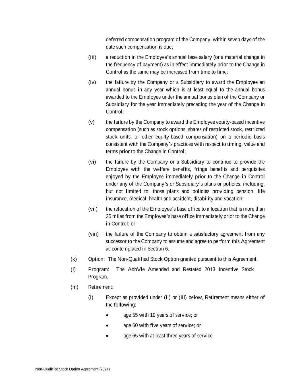 Non-Qualified Stock Option Agreement (2024) deferred compensation program of the Company, within seven days of the date such compensation is due; (iii) a reduction in the Employee’s annual base salary (or a material change in the frequency of payment) as in effect immediately prior to the Change in Control as the same may be increased from time to time; (iv) the failure by the Company or a Subsidiary to award the Employee an annual bonus in any year which is at least equal to the annual bonus awarded to the Employee under the annual bonus plan of the Company or Subsidiary for the year immediately preceding the year of the Change in Control; (v) the failure by the Company to award the Employee equity-based incentive compensation (such as stock options, shares of restricted stock, restricted stock units, or other equity-based compensation) on a periodic basis consistent with the Company’s practices with respect to timing, value and terms prior to the Change in Control; (vi) the failure by the Company or a Subsidiary to continue to provide the Employee with the welfare benefits, fringe benefits and perquisites enjoyed by the Employee immediately prior to the Change in Control under any of the Company’s or Subsidiary’s plans or policies, including, but not limited to, those plans and policies providing pension, life insurance, medical, health and accident, disability and vacation; (vii) the relocation of the Employee’s base office to a location that is more than 35 miles from the Employee’s base office immediately prior to the Change in Control; or (viii) the failure of the Company to obtain a satisfactory agreement from any successor to the Company to assume and agree to perform this Agreement as contemplated in Section 6. (k) Option: The Non-Qualified Stock Option granted pursuant to this Agreement. (l) Program: The AbbVie Amended and Restated 2013 Incentive Stock Program. (m) Retirement: (i) Except as provided under (ii) or (iii) below, Retirement means either of the following: age 55 with 10 years of service; or age 60 with five years of service; or age 65 with at least three years of service.