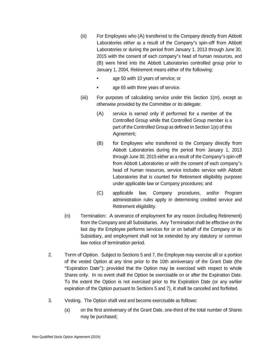 Non-Qualified Stock Option Agreement (2024) (ii) For Employees who (A) transferred to the Company directly from Abbott Laboratories either as a result of the Company’s spin-off from Abbott Laboratories or during the period from January 1, 2013 through June 30, 2015 with the consent of each company’s head of human resources, and (B) were hired into the Abbott Laboratories controlled group prior to January 1, 2004, Retirement means either of the following: • age 50 with 10 years of service; or • age 65 with three years of service. (iii) For purposes of calculating service under this Section 1(m), except as otherwise provided by the Committee or its delegate: (A) service is earned only if performed for a member of the Controlled Group while that Controlled Group member is a part of the Controlled Group as defined in Section 1(e) of this Agreement; (B) for Employees who transferred to the Company directly from Abbott Laboratories during the period from January 1, 2013 through June 30, 2015 either as a result of the Company’s spin-off from Abbott Laboratories or with the consent of each company’s head of human resources, service includes service with Abbott Laboratories that is counted for Retirement eligibility purposes under applicable law or Company procedures; and (C) applicable law, Company procedures, and/or Program administration rules apply in determining credited service and Retirement eligibility. (n) Termination: A severance of employment for any reason (including Retirement) from the Company and all Subsidiaries. Any Termination shall be effective on the last day the Employee performs services for or on behalf of the Company or its Subsidiary, and employment shall not be extended by any statutory or common law notice of termination period. 2. Term of Option. Subject to Sections 5 and 7, the Employee may exercise all or a portion of the vested Option at any time prior to the 10th anniversary of the Grant Date (the “Expiration Date”); provided that the Option may be exercised with respect to whole Shares only. In no event shall the Option be exercisable on or after the Expiration Date. To the extent the Option is not exercised prior to the Expiration Date (or any earlier expiration of the Option pursuant to Sections 5 and 7), it shall be canceled and forfeited. 3. Vesting. The Option shall vest and become exercisable as follows: (a) on the first anniversary of the Grant Date, one-third of the total number of Shares may be purchased;