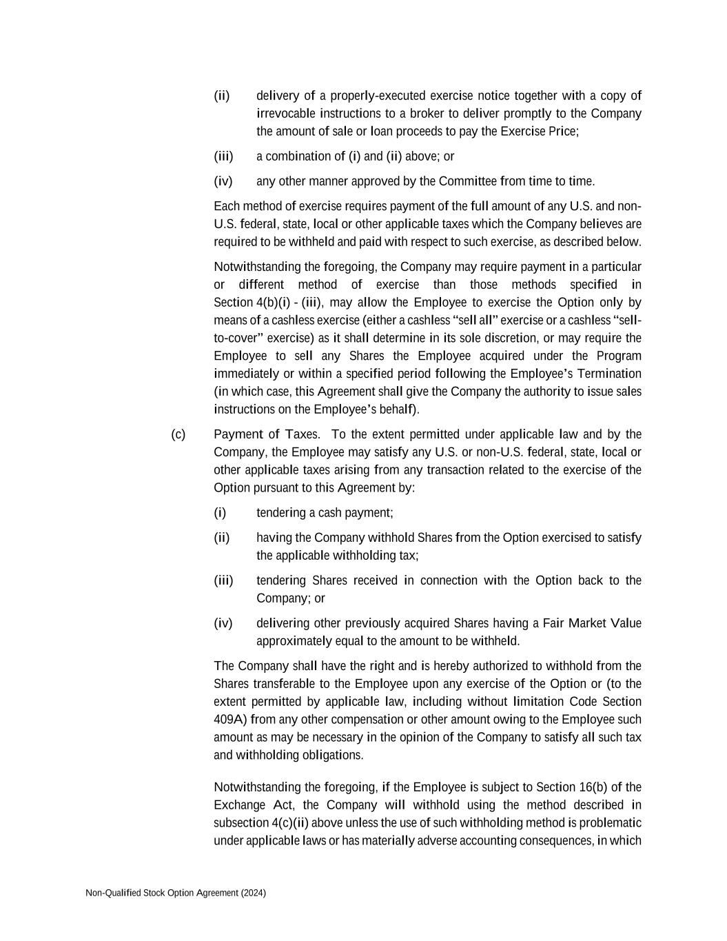 Non-Qualified Stock Option Agreement (2024) (ii) delivery of a properly-executed exercise notice together with a copy of irrevocable instructions to a broker to deliver promptly to the Company the amount of sale or loan proceeds to pay the Exercise Price; (iii) a combination of (i) and (ii) above; or (iv) any other manner approved by the Committee from time to time. Each method of exercise requires payment of the full amount of any U.S. and non- U.S. federal, state, local or other applicable taxes which the Company believes are required to be withheld and paid with respect to such exercise, as described below. Notwithstanding the foregoing, the Company may require payment in a particular or different method of exercise than those methods specified in Section 4(b)(i) - (iii), may allow the Employee to exercise the Option only by means of a cashless exercise (either a cashless “sell all” exercise or a cashless “sell- to-cover” exercise) as it shall determine in its sole discretion, or may require the Employee to sell any Shares the Employee acquired under the Program immediately or within a specified period following the Employee’s Termination (in which case, this Agreement shall give the Company the authority to issue sales instructions on the Employee’s behalf). (c) Payment of Taxes. To the extent permitted under applicable law and by the Company, the Employee may satisfy any U.S. or non-U.S. federal, state, local or other applicable taxes arising from any transaction related to the exercise of the Option pursuant to this Agreement by: (i) tendering a cash payment; (ii) having the Company withhold Shares from the Option exercised to satisfy the applicable withholding tax; (iii) tendering Shares received in connection with the Option back to the Company; or (iv) delivering other previously acquired Shares having a Fair Market Value approximately equal to the amount to be withheld. The Company shall have the right and is hereby authorized to withhold from the Shares transferable to the Employee upon any exercise of the Option or (to the extent permitted by applicable law, including without limitation Code Section 409A) from any other compensation or other amount owing to the Employee such amount as may be necessary in the opinion of the Company to satisfy all such tax and withholding obligations. Notwithstanding the foregoing, if the Employee is subject to Section 16(b) of the Exchange Act, the Company will withhold using the method described in subsection 4(c)(ii) above unless the use of such withholding method is problematic under applicable laws or has materially adverse accounting consequences, in which