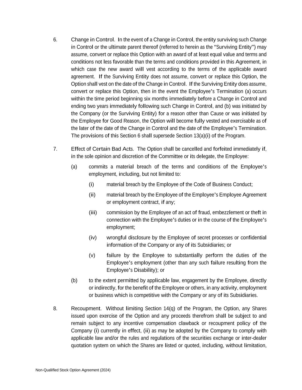 Non-Qualified Stock Option Agreement (2024) 6. Change in Control. In the event of a Change in Control, the entity surviving such Change in Control or the ultimate parent thereof (referred to herein as the “Surviving Entity”) may assume, convert or replace this Option with an award of at least equal value and terms and conditions not less favorable than the terms and conditions provided in this Agreement, in which case the new award will vest according to the terms of the applicable award agreement. If the Surviving Entity does not assume, convert or replace this Option, the Option shall vest on the date of the Change in Control. If the Surviving Entity does assume, convert or replace this Option, then in the event the Employee’s Termination (a) occurs within the time period beginning six months immediately before a Change in Control and ending two years immediately following such Change in Control, and (b) was initiated by the Company (or the Surviving Entity) for a reason other than Cause or was initiated by the Employee for Good Reason, the Option will become fully vested and exercisable as of the later of the date of the Change in Control and the date of the Employee’s Termination. The provisions of this Section 6 shall supersede Section 13(a)(i) of the Program. 7. Effect of Certain Bad Acts. The Option shall be cancelled and forfeited immediately if, in the sole opinion and discretion of the Committee or its delegate, the Employee: (a) commits a material breach of the terms and conditions of the Employee’s employment, including, but not limited to: (i) material breach by the Employee of the Code of Business Conduct; (ii) material breach by the Employee of the Employee’s Employee Agreement or employment contract, if any; (iii) commission by the Employee of an act of fraud, embezzlement or theft in connection with the Employee’s duties or in the course of the Employee’s employment; (iv) wrongful disclosure by the Employee of secret processes or confidential information of the Company or any of its Subsidiaries; or (v) failure by the Employee to substantially perform the duties of the Employee’s employment (other than any such failure resulting from the Employee’s Disability); or (b) to the extent permitted by applicable law, engagement by the Employee, directly or indirectly, for the benefit of the Employee or others, in any activity, employment or business which is competitive with the Company or any of its Subsidiaries. 8. Recoupment. Without limiting Section 14(q) of the Program, the Option, any Shares issued upon exercise of the Option and any proceeds therefrom shall be subject to and remain subject to any incentive compensation clawback or recoupment policy of the Company (i) currently in effect, (ii) as may be adopted by the Company to comply with applicable law and/or the rules and regulations of the securities exchange or inter-dealer quotation system on which the Shares are listed or quoted, including, without limitation,