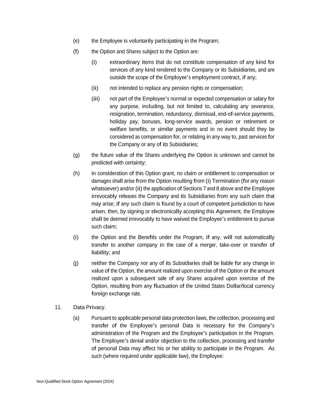 Non-Qualified Stock Option Agreement (2024) (e) the Employee is voluntarily participating in the Program; (f) the Option and Shares subject to the Option are: (i) extraordinary items that do not constitute compensation of any kind for services of any kind rendered to the Company or its Subsidiaries, and are outside the scope of the Employee’s employment contract, if any; (ii) not intended to replace any pension rights or compensation; (iii) not part of the Employee’s normal or expected compensation or salary for any purpose, including, but not limited to, calculating any severance, resignation, termination, redundancy, dismissal, end-of-service payments, holiday pay, bonuses, long-service awards, pension or retirement or welfare benefits, or similar payments and in no event should they be considered as compensation for, or relating in any way to, past services for the Company or any of its Subsidiaries; (g) the future value of the Shares underlying the Option is unknown and cannot be predicted with certainty; (h) in consideration of this Option grant, no claim or entitlement to compensation or damages shall arise from the Option resulting from (i) Termination (for any reason whatsoever) and/or (ii) the application of Sections 7 and 8 above and the Employee irrevocably releases the Company and its Subsidiaries from any such claim that may arise; if any such claim is found by a court of competent jurisdiction to have arisen, then, by signing or electronically accepting this Agreement, the Employee shall be deemed irrevocably to have waived the Employee’s entitlement to pursue such claim; (i) the Option and the Benefits under the Program, if any, will not automatically transfer to another company in the case of a merger, take-over or transfer of liability; and (j) neither the Company nor any of its Subsidiaries shall be liable for any change in value of the Option, the amount realized upon exercise of the Option or the amount realized upon a subsequent sale of any Shares acquired upon exercise of the Option, resulting from any fluctuation of the United States Dollar/local currency foreign exchange rate. 11. Data Privacy. (a) Pursuant to applicable personal data protection laws, the collection, processing and transfer of the Employee’s personal Data is necessary for the Company’s administration of the Program and the Employee’s participation in the Program. The Employee’s denial and/or objection to the collection, processing and transfer of personal Data may affect his or her ability to participate in the Program. As such (where required under applicable law), the Employee: