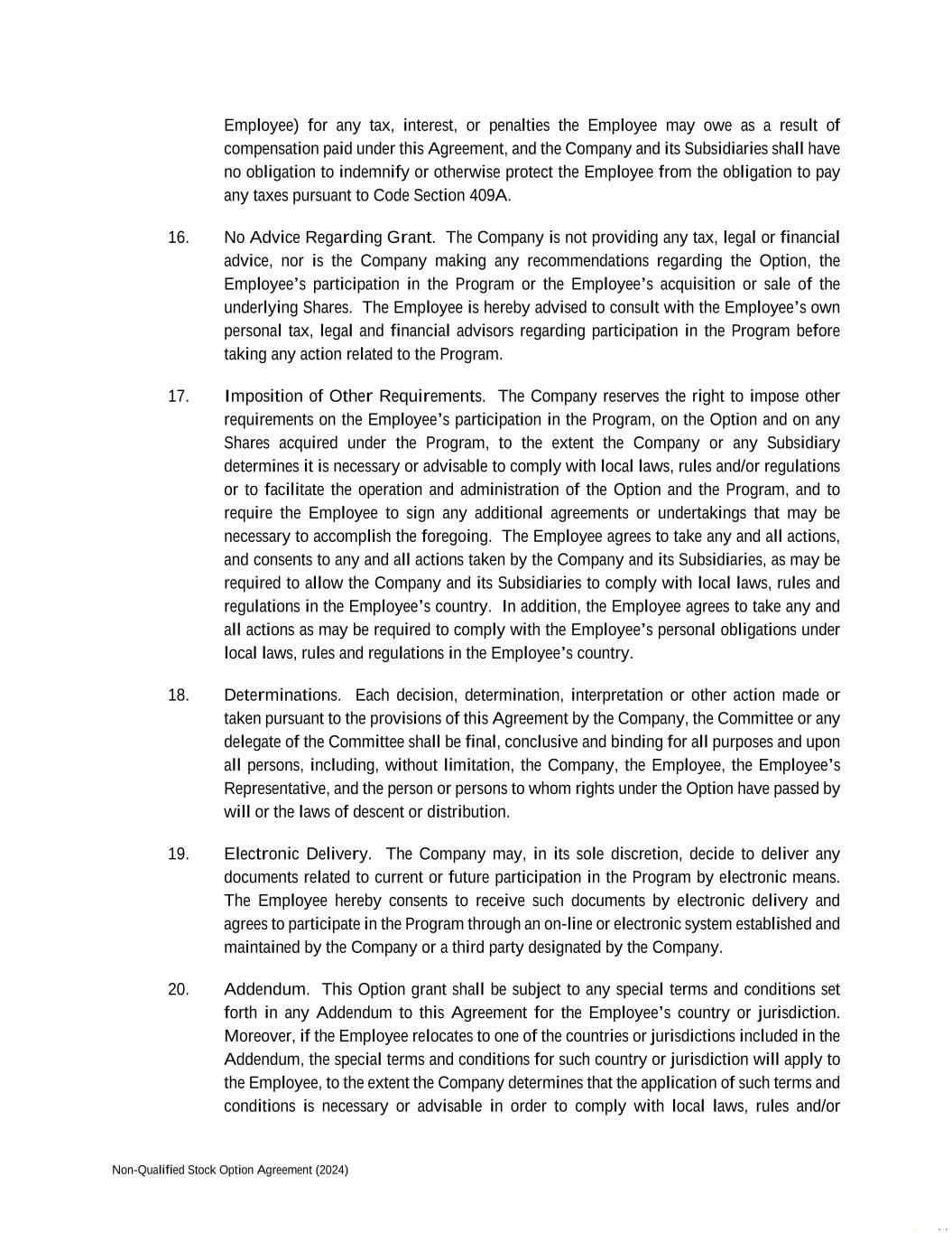 Non-Qualified Stock Option Agreement (2024) Employee) for any tax, interest, or penalties the Employee may owe as a result of compensation paid under this Agreement, and the Company and its Subsidiaries shall have no obligation to indemnify or otherwise protect the Employee from the obligation to pay any taxes pursuant to Code Section 409A. 16. No Advice Regarding Grant. The Company is not providing any tax, legal or financial advice, nor is the Company making any recommendations regarding the Option, the Employee’s participation in the Program or the Employee’s acquisition or sale of the underlying Shares. The Employee is hereby advised to consult with the Employee’s own personal tax, legal and financial advisors regarding participation in the Program before taking any action related to the Program. 17. Imposition of Other Requirements. The Company reserves the right to impose other requirements on the Employee’s participation in the Program, on the Option and on any Shares acquired under the Program, to the extent the Company or any Subsidiary determines it is necessary or advisable to comply with local laws, rules and/or regulations or to facilitate the operation and administration of the Option and the Program, and to require the Employee to sign any additional agreements or undertakings that may be necessary to accomplish the foregoing. The Employee agrees to take any and all actions, and consents to any and all actions taken by the Company and its Subsidiaries, as may be required to allow the Company and its Subsidiaries to comply with local laws, rules and regulations in the Employee’s country. In addition, the Employee agrees to take any and all actions as may be required to comply with the Employee’s personal obligations under local laws, rules and regulations in the Employee’s country. 18. Determinations. Each decision, determination, interpretation or other action made or taken pursuant to the provisions of this Agreement by the Company, the Committee or any delegate of the Committee shall be final, conclusive and binding for all purposes and upon all persons, including, without limitation, the Company, the Employee, the Employee’s Representative, and the person or persons to whom rights under the Option have passed by will or the laws of descent or distribution. 19. Electronic Delivery. The Company may, in its sole discretion, decide to deliver any documents related to current or future participation in the Program by electronic means. The Employee hereby consents to receive such documents by electronic delivery and agrees to participate in the Program through an on-line or electronic system established and maintained by the Company or a third party designated by the Company. 20. Addendum. This Option grant shall be subject to any special terms and conditions set forth in any Addendum to this Agreement for the Employee’s country or jurisdiction. Moreover, if the Employee relocates to one of the countries or jurisdictions included in the Addendum, the special terms and conditions for such country or jurisdiction will apply to the Employee, to the extent the Company determines that the application of such terms and conditions is necessary or advisable in order to comply with local laws, rules and/or