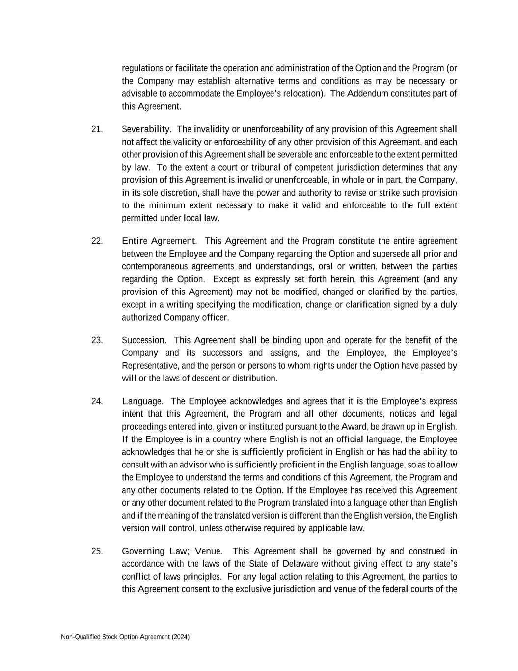 Non-Qualified Stock Option Agreement (2024) regulations or facilitate the operation and administration of the Option and the Program (or the Company may establish alternative terms and conditions as may be necessary or advisable to accommodate the Employee’s relocation). The Addendum constitutes part of this Agreement. 21. Severability. The invalidity or unenforceability of any provision of this Agreement shall not affect the validity or enforceability of any other provision of this Agreement, and each other provision of this Agreement shall be severable and enforceable to the extent permitted by law. To the extent a court or tribunal of competent jurisdiction determines that any provision of this Agreement is invalid or unenforceable, in whole or in part, the Company, in its sole discretion, shall have the power and authority to revise or strike such provision to the minimum extent necessary to make it valid and enforceable to the full extent permitted under local law. 22. Entire Agreement. This Agreement and the Program constitute the entire agreement between the Employee and the Company regarding the Option and supersede all prior and contemporaneous agreements and understandings, oral or written, between the parties regarding the Option. Except as expressly set forth herein, this Agreement (and any provision of this Agreement) may not be modified, changed or clarified by the parties, except in a writing specifying the modification, change or clarification signed by a duly authorized Company officer. 23. Succession. This Agreement shall be binding upon and operate for the benefit of the Company and its successors and assigns, and the Employee, the Employee’s Representative, and the person or persons to whom rights under the Option have passed by will or the laws of descent or distribution. 24. Language. The Employee acknowledges and agrees that it is the Employee’s express intent that this Agreement, the Program and all other documents, notices and legal proceedings entered into, given or instituted pursuant to the Award, be drawn up in English. If the Employee is in a country where English is not an official language, the Employee acknowledges that he or she is sufficiently proficient in English or has had the ability to consult with an advisor who is sufficiently proficient in the English language, so as to allow the Employee to understand the terms and conditions of this Agreement, the Program and any other documents related to the Option. If the Employee has received this Agreement or any other document related to the Program translated into a language other than English and if the meaning of the translated version is different than the English version, the English version will control, unless otherwise required by applicable law. 25. Governing Law; Venue. This Agreement shall be governed by and construed in accordance with the laws of the State of Delaware without giving effect to any state’s conflict of laws principles. For any legal action relating to this Agreement, the parties to this Agreement consent to the exclusive jurisdiction and venue of the federal courts of the