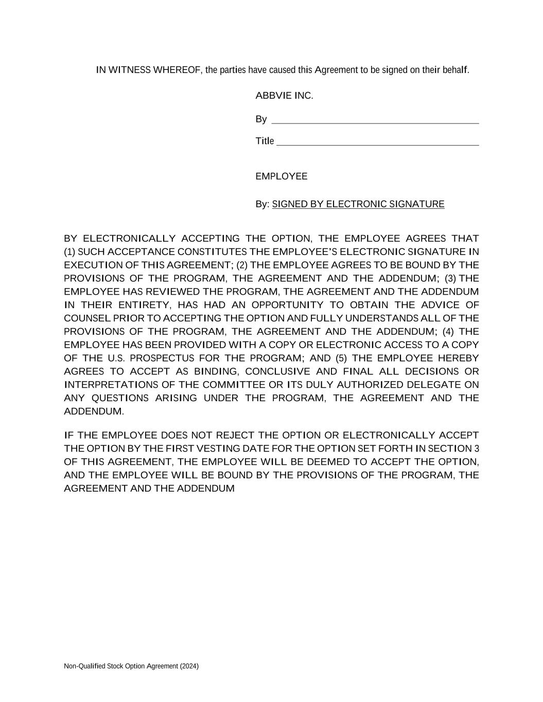 Non-Qualified Stock Option Agreement (2024) IN WITNESS WHEREOF, the parties have caused this Agreement to be signed on their behalf. ABBVIE INC. By Title EMPLOYEE By: SIGNED BY ELECTRONIC SIGNATURE BY ELECTRONICALLY ACCEPTING THE OPTION, THE EMPLOYEE AGREES THAT (1) SUCH ACCEPTANCE CONSTITUTES THE EMPLOYEE’S ELECTRONIC SIGNATURE IN EXECUTION OF THIS AGREEMENT; (2) THE EMPLOYEE AGREES TO BE BOUND BY THE PROVISIONS OF THE PROGRAM, THE AGREEMENT AND THE ADDENDUM; (3) THE EMPLOYEE HAS REVIEWED THE PROGRAM, THE AGREEMENT AND THE ADDENDUM IN THEIR ENTIRETY, HAS HAD AN OPPORTUNITY TO OBTAIN THE ADVICE OF COUNSEL PRIOR TO ACCEPTING THE OPTION AND FULLY UNDERSTANDS ALL OF THE PROVISIONS OF THE PROGRAM, THE AGREEMENT AND THE ADDENDUM; (4) THE EMPLOYEE HAS BEEN PROVIDED WITH A COPY OR ELECTRONIC ACCESS TO A COPY OF THE U.S. PROSPECTUS FOR THE PROGRAM; AND (5) THE EMPLOYEE HEREBY AGREES TO ACCEPT AS BINDING, CONCLUSIVE AND FINAL ALL DECISIONS OR INTERPRETATIONS OF THE COMMITTEE OR ITS DULY AUTHORIZED DELEGATE ON ANY QUESTIONS ARISING UNDER THE PROGRAM, THE AGREEMENT AND THE ADDENDUM. IF THE EMPLOYEE DOES NOT REJECT THE OPTION OR ELECTRONICALLY ACCEPT THE OPTION BY THE FIRST VESTING DATE FOR THE OPTION SET FORTH IN SECTION 3 OF THIS AGREEMENT, THE EMPLOYEE WILL BE DEEMED TO ACCEPT THE OPTION, AND THE EMPLOYEE WILL BE BOUND BY THE PROVISIONS OF THE PROGRAM, THE AGREEMENT AND THE ADDENDUM
