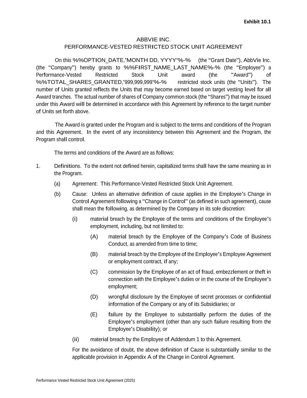 Exhibit 10.1 Performance Vested Restricted Stock Unit Agreement (2025) ABBVIE INC. PERFORMANCE-VESTED RESTRICTED STOCK UNIT AGREEMENT On this %%OPTION_DATE,'MONTH DD, YYYY'%-% (the “Grant Date”), AbbVie Inc. (the “Company”) hereby grants to %%FIRST_NAME_LAST_NAME%-% (the “Employee”) a Performance-Vested Restricted Stock Unit award (the “Award”) of %%TOTAL_SHARES_GRANTED,'999,999,999'%-% restricted stock units (the “Units”). The number of Units granted reflects the Units that may become earned based on target vesting level for all Award tranches. The actual number of shares of Company common stock (the “Shares”) that may be issued under this Award will be determined in accordance with this Agreement by reference to the target number of Units set forth above. The Award is granted under the Program and is subject to the terms and conditions of the Program and this Agreement. In the event of any inconsistency between this Agreement and the Program, the Program shall control. The terms and conditions of the Award are as follows: 1. Definitions. To the extent not defined herein, capitalized terms shall have the same meaning as in the Program. (a) Agreement: This Performance-Vested Restricted Stock Unit Agreement. (b) Cause: Unless an alternative definition of cause applies in the Employee’s Change in Control Agreement following a “Change in Control” (as defined in such agreement), cause shall mean the following, as determined by the Company in its sole discretion: (i) material breach by the Employee of the terms and conditions of the Employee’s employment, including, but not limited to: (A) material breach by the Employee of the Company’s Code of Business Conduct, as amended from time to time; (B) material breach by the Employee of the Employee’s Employee Agreement or employment contract, if any; (C) commission by the Employee of an act of fraud, embezzlement or theft in connection with the Employee’s duties or in the course of the Employee’s employment; (D) wrongful disclosure by the Employee of secret processes or confidential information of the Company or any of its Subsidiaries; or (E) failure by the Employee to substantially perform the duties of the Employee’s employment (other than any such failure resulting from the Employee’s Disability); or (ii) material breach by the Employee of Addendum 1 to this Agreement. For the avoidance of doubt, the above definition of Cause is substantially similar to the applicable provision in Appendix A of the Change in Control Agreement.