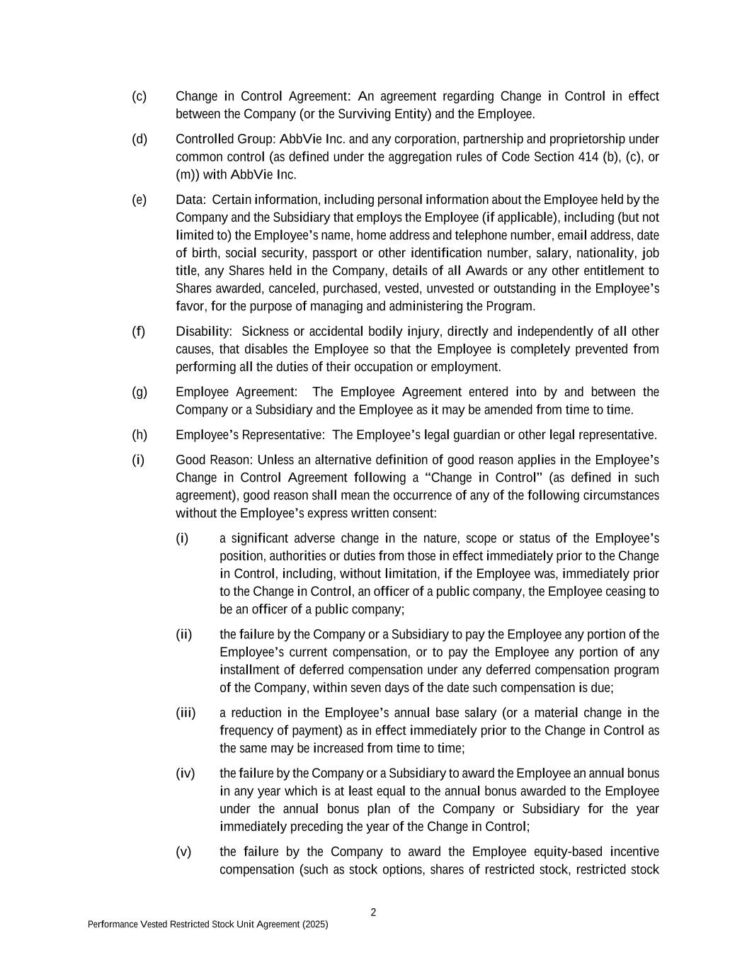 2 Performance Vested Restricted Stock Unit Agreement (2025) (c) Change in Control Agreement: An agreement regarding Change in Control in effect between the Company (or the Surviving Entity) and the Employee. (d) Controlled Group: AbbVie Inc. and any corporation, partnership and proprietorship under common control (as defined under the aggregation rules of Code Section 414 (b), (c), or (m)) with AbbVie Inc. (e) Data: Certain information, including personal information about the Employee held by the Company and the Subsidiary that employs the Employee (if applicable), including (but not limited to) the Employee’s name, home address and telephone number, email address, date of birth, social security, passport or other identification number, salary, nationality, job title, any Shares held in the Company, details of all Awards or any other entitlement to Shares awarded, canceled, purchased, vested, unvested or outstanding in the Employee’s favor, for the purpose of managing and administering the Program. (f) Disability: Sickness or accidental bodily injury, directly and independently of all other causes, that disables the Employee so that the Employee is completely prevented from performing all the duties of their occupation or employment. (g) Employee Agreement: The Employee Agreement entered into by and between the Company or a Subsidiary and the Employee as it may be amended from time to time. (h) Employee’s Representative: The Employee’s legal guardian or other legal representative. (i) Good Reason: Unless an alternative definition of good reason applies in the Employee’s Change in Control Agreement following a “Change in Control” (as defined in such agreement), good reason shall mean the occurrence of any of the following circumstances without the Employee’s express written consent: (i) a significant adverse change in the nature, scope or status of the Employee’s position, authorities or duties from those in effect immediately prior to the Change in Control, including, without limitation, if the Employee was, immediately prior to the Change in Control, an officer of a public company, the Employee ceasing to be an officer of a public company; (ii) the failure by the Company or a Subsidiary to pay the Employee any portion of the Employee’s current compensation, or to pay the Employee any portion of any installment of deferred compensation under any deferred compensation program of the Company, within seven days of the date such compensation is due; (iii) a reduction in the Employee’s annual base salary (or a material change in the frequency of payment) as in effect immediately prior to the Change in Control as the same may be increased from time to time; (iv) the failure by the Company or a Subsidiary to award the Employee an annual bonus in any year which is at least equal to the annual bonus awarded to the Employee under the annual bonus plan of the Company or Subsidiary for the year immediately preceding the year of the Change in Control; (v) the failure by the Company to award the Employee equity-based incentive compensation (such as stock options, shares of restricted stock, restricted stock