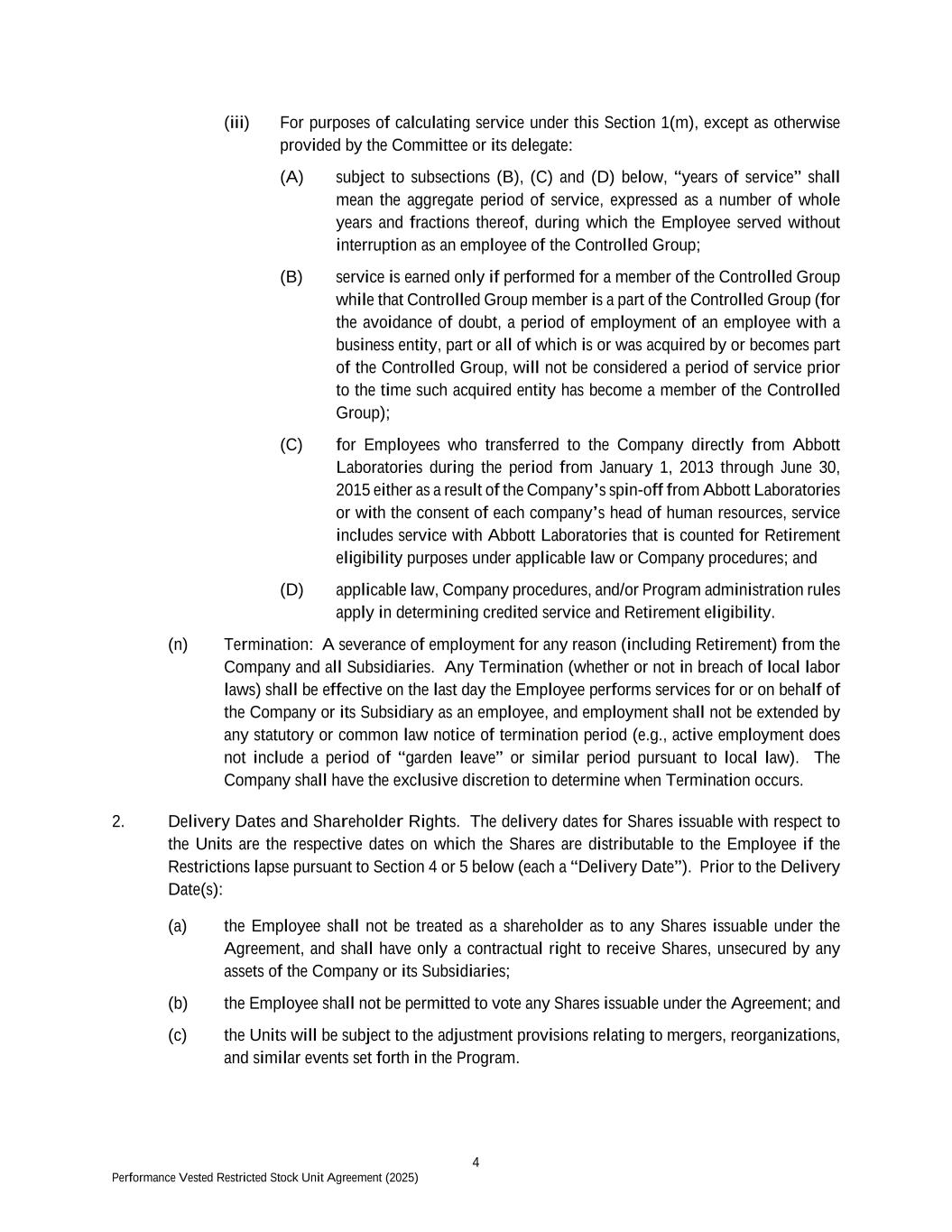 4 Performance Vested Restricted Stock Unit Agreement (2025) (iii) For purposes of calculating service under this Section 1(m), except as otherwise provided by the Committee or its delegate: (A) subject to subsections (B), (C) and (D) below, “years of service” shall mean the aggregate period of service, expressed as a number of whole years and fractions thereof, during which the Employee served without interruption as an employee of the Controlled Group; (B) service is earned only if performed for a member of the Controlled Group while that Controlled Group member is a part of the Controlled Group (for the avoidance of doubt, a period of employment of an employee with a business entity, part or all of which is or was acquired by or becomes part of the Controlled Group, will not be considered a period of service prior to the time such acquired entity has become a member of the Controlled Group); (C) for Employees who transferred to the Company directly from Abbott Laboratories during the period from January 1, 2013 through June 30, 2015 either as a result of the Company’s spin-off from Abbott Laboratories or with the consent of each company’s head of human resources, service includes service with Abbott Laboratories that is counted for Retirement eligibility purposes under applicable law or Company procedures; and (D) applicable law, Company procedures, and/or Program administration rules apply in determining credited service and Retirement eligibility. (n) Termination: A severance of employment for any reason (including Retirement) from the Company and all Subsidiaries. Any Termination (whether or not in breach of local labor laws) shall be effective on the last day the Employee performs services for or on behalf of the Company or its Subsidiary as an employee, and employment shall not be extended by any statutory or common law notice of termination period (e.g., active employment does not include a period of “garden leave” or similar period pursuant to local law). The Company shall have the exclusive discretion to determine when Termination occurs. 2. Delivery Dates and Shareholder Rights. The delivery dates for Shares issuable with respect to the Units are the respective dates on which the Shares are distributable to the Employee if the Restrictions lapse pursuant to Section 4 or 5 below (each a “Delivery Date”). Prior to the Delivery Date(s): (a) the Employee shall not be treated as a shareholder as to any Shares issuable under the Agreement, and shall have only a contractual right to receive Shares, unsecured by any assets of the Company or its Subsidiaries; (b) the Employee shall not be permitted to vote any Shares issuable under the Agreement; and (c) the Units will be subject to the adjustment provisions relating to mergers, reorganizations, and similar events set forth in the Program.