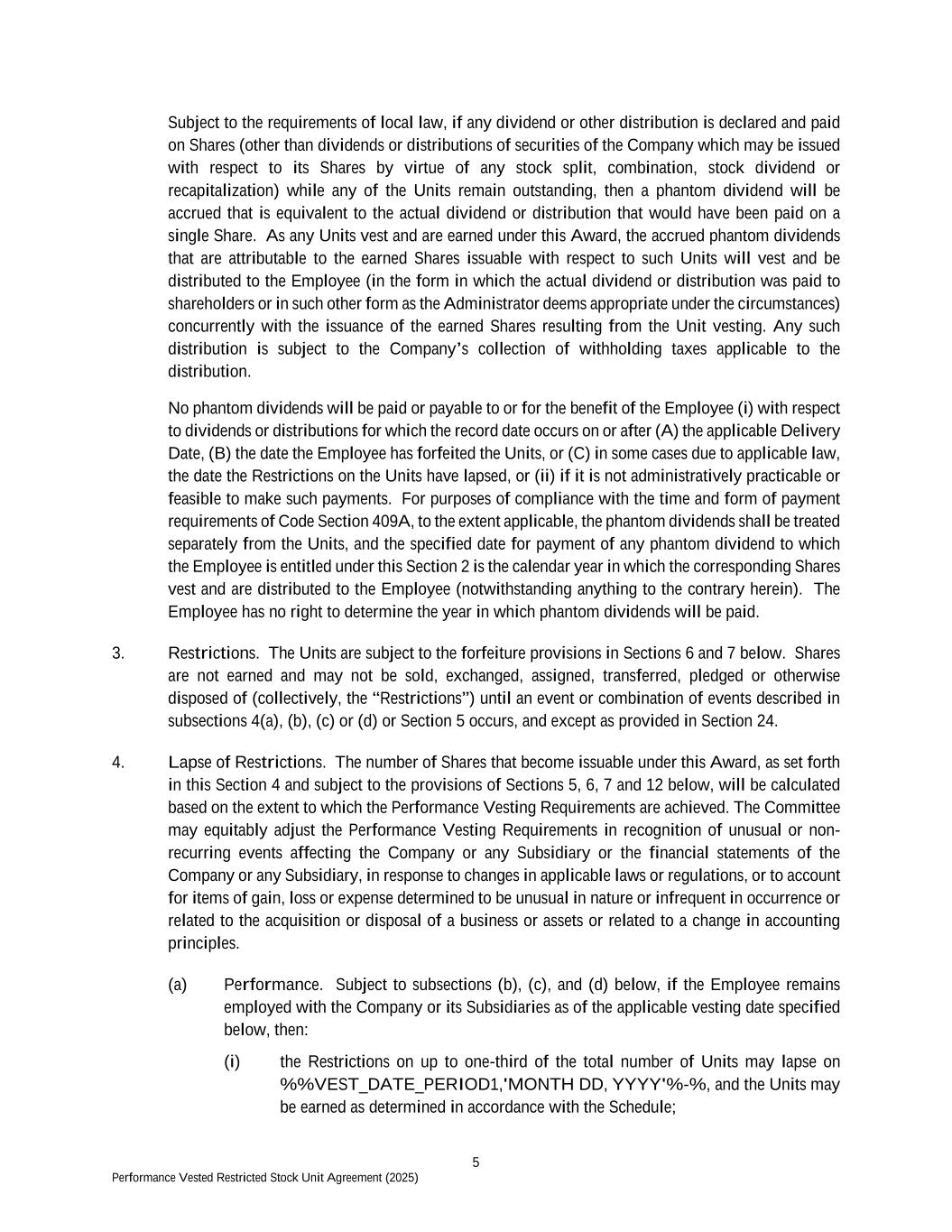 5 Performance Vested Restricted Stock Unit Agreement (2025) Subject to the requirements of local law, if any dividend or other distribution is declared and paid on Shares (other than dividends or distributions of securities of the Company which may be issued with respect to its Shares by virtue of any stock split, combination, stock dividend or recapitalization) while any of the Units remain outstanding, then a phantom dividend will be accrued that is equivalent to the actual dividend or distribution that would have been paid on a single Share. As any Units vest and are earned under this Award, the accrued phantom dividends that are attributable to the earned Shares issuable with respect to such Units will vest and be distributed to the Employee (in the form in which the actual dividend or distribution was paid to shareholders or in such other form as the Administrator deems appropriate under the circumstances) concurrently with the issuance of the earned Shares resulting from the Unit vesting. Any such distribution is subject to the Company’s collection of withholding taxes applicable to the distribution. No phantom dividends will be paid or payable to or for the benefit of the Employee (i) with respect to dividends or distributions for which the record date occurs on or after (A) the applicable Delivery Date, (B) the date the Employee has forfeited the Units, or (C) in some cases due to applicable law, the date the Restrictions on the Units have lapsed, or (ii) if it is not administratively practicable or feasible to make such payments. For purposes of compliance with the time and form of payment requirements of Code Section 409A, to the extent applicable, the phantom dividends shall be treated separately from the Units, and the specified date for payment of any phantom dividend to which the Employee is entitled under this Section 2 is the calendar year in which the corresponding Shares vest and are distributed to the Employee (notwithstanding anything to the contrary herein). The Employee has no right to determine the year in which phantom dividends will be paid. 3. Restrictions. The Units are subject to the forfeiture provisions in Sections 6 and 7 below. Shares are not earned and may not be sold, exchanged, assigned, transferred, pledged or otherwise disposed of (collectively, the “Restrictions”) until an event or combination of events described in subsections 4(a), (b), (c) or (d) or Section 5 occurs, and except as provided in Section 24. 4. Lapse of Restrictions. The number of Shares that become issuable under this Award, as set forth in this Section 4 and subject to the provisions of Sections 5, 6, 7 and 12 below, will be calculated based on the extent to which the Performance Vesting Requirements are achieved. The Committee may equitably adjust the Performance Vesting Requirements in recognition of unusual or non- recurring events affecting the Company or any Subsidiary or the financial statements of the Company or any Subsidiary, in response to changes in applicable laws or regulations, or to account for items of gain, loss or expense determined to be unusual in nature or infrequent in occurrence or related to the acquisition or disposal of a business or assets or related to a change in accounting principles. (a) Performance. Subject to subsections (b), (c), and (d) below, if the Employee remains employed with the Company or its Subsidiaries as of the applicable vesting date specified below, then: (i) the Restrictions on up to one-third of the total number of Units may lapse on %%VEST_DATE_PERIOD1,'MONTH DD, YYYY'%-%, and the Units may be earned as determined in accordance with the Schedule;