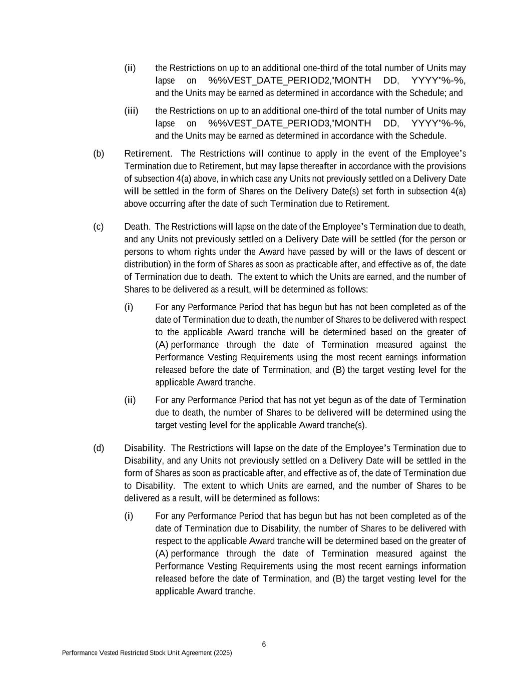6 Performance Vested Restricted Stock Unit Agreement (2025) (ii) the Restrictions on up to an additional one-third of the total number of Units may lapse on %%VEST_DATE_PERIOD2,'MONTH DD, YYYY'%-%, and the Units may be earned as determined in accordance with the Schedule; and (iii) the Restrictions on up to an additional one-third of the total number of Units may lapse on %%VEST_DATE_PERIOD3,'MONTH DD, YYYY'%-%, and the Units may be earned as determined in accordance with the Schedule. (b) Retirement. The Restrictions will continue to apply in the event of the Employee’s Termination due to Retirement, but may lapse thereafter in accordance with the provisions of subsection 4(a) above, in which case any Units not previously settled on a Delivery Date will be settled in the form of Shares on the Delivery Date(s) set forth in subsection 4(a) above occurring after the date of such Termination due to Retirement. (c) Death. The Restrictions will lapse on the date of the Employee’s Termination due to death, and any Units not previously settled on a Delivery Date will be settled (for the person or persons to whom rights under the Award have passed by will or the laws of descent or distribution) in the form of Shares as soon as practicable after, and effective as of, the date of Termination due to death. The extent to which the Units are earned, and the number of Shares to be delivered as a result, will be determined as follows: (i) For any Performance Period that has begun but has not been completed as of the date of Termination due to death, the number of Shares to be delivered with respect to the applicable Award tranche will be determined based on the greater of (A) performance through the date of Termination measured against the Performance Vesting Requirements using the most recent earnings information released before the date of Termination, and (B) the target vesting level for the applicable Award tranche. (ii) For any Performance Period that has not yet begun as of the date of Termination due to death, the number of Shares to be delivered will be determined using the target vesting level for the applicable Award tranche(s). (d) Disability. The Restrictions will lapse on the date of the Employee’s Termination due to Disability, and any Units not previously settled on a Delivery Date will be settled in the form of Shares as soon as practicable after, and effective as of, the date of Termination due to Disability. The extent to which Units are earned, and the number of Shares to be delivered as a result, will be determined as follows: (i) For any Performance Period that has begun but has not been completed as of the date of Termination due to Disability, the number of Shares to be delivered with respect to the applicable Award tranche will be determined based on the greater of (A) performance through the date of Termination measured against the Performance Vesting Requirements using the most recent earnings information released before the date of Termination, and (B) the target vesting level for the applicable Award tranche.