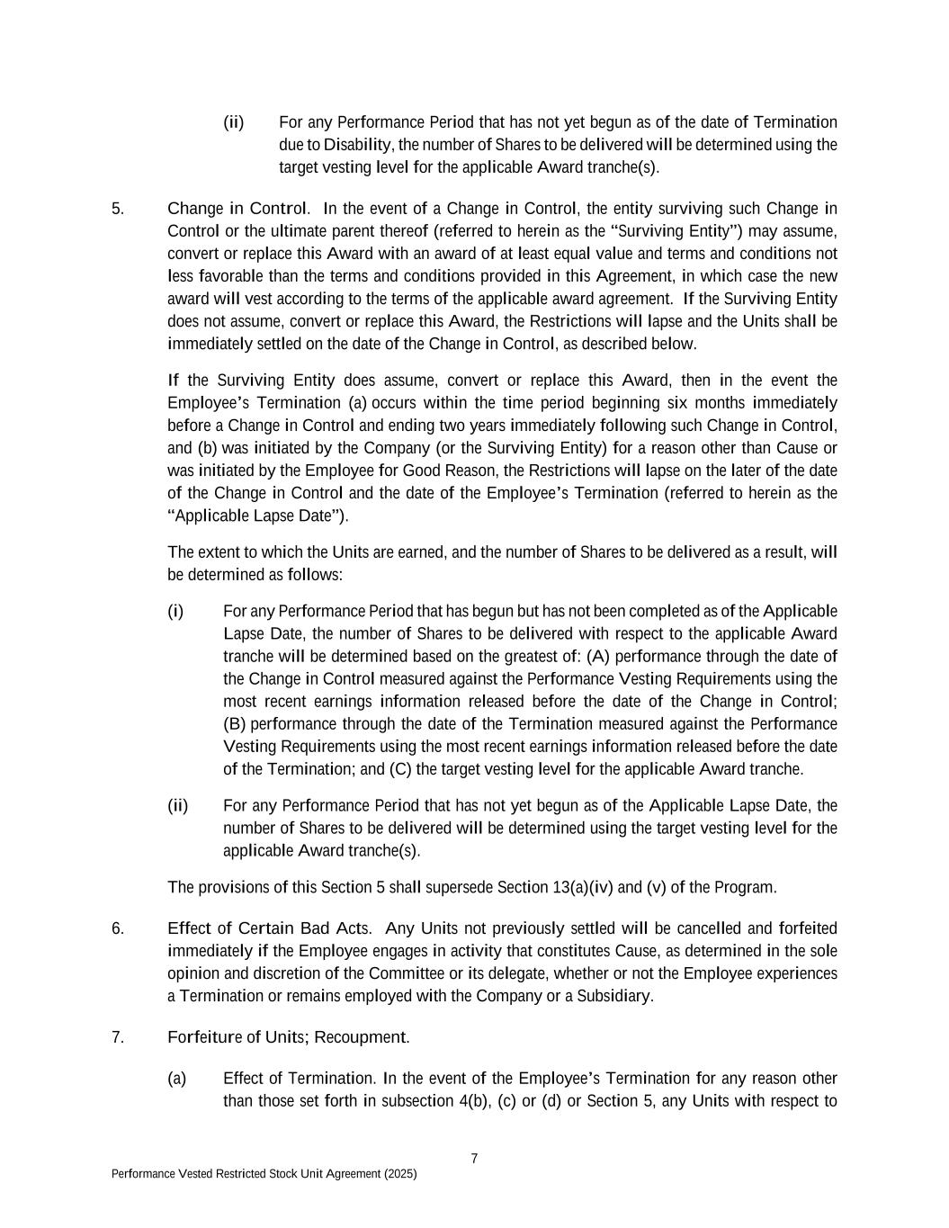 7 Performance Vested Restricted Stock Unit Agreement (2025) (ii) For any Performance Period that has not yet begun as of the date of Termination due to Disability, the number of Shares to be delivered will be determined using the target vesting level for the applicable Award tranche(s). 5. Change in Control. In the event of a Change in Control, the entity surviving such Change in Control or the ultimate parent thereof (referred to herein as the “Surviving Entity”) may assume, convert or replace this Award with an award of at least equal value and terms and conditions not less favorable than the terms and conditions provided in this Agreement, in which case the new award will vest according to the terms of the applicable award agreement. If the Surviving Entity does not assume, convert or replace this Award, the Restrictions will lapse and the Units shall be immediately settled on the date of the Change in Control, as described below. If the Surviving Entity does assume, convert or replace this Award, then in the event the Employee’s Termination (a) occurs within the time period beginning six months immediately before a Change in Control and ending two years immediately following such Change in Control, and (b) was initiated by the Company (or the Surviving Entity) for a reason other than Cause or was initiated by the Employee for Good Reason, the Restrictions will lapse on the later of the date of the Change in Control and the date of the Employee’s Termination (referred to herein as the “Applicable Lapse Date”). The extent to which the Units are earned, and the number of Shares to be delivered as a result, will be determined as follows: (i) For any Performance Period that has begun but has not been completed as of the Applicable Lapse Date, the number of Shares to be delivered with respect to the applicable Award tranche will be determined based on the greatest of: (A) performance through the date of the Change in Control measured against the Performance Vesting Requirements using the most recent earnings information released before the date of the Change in Control; (B) performance through the date of the Termination measured against the Performance Vesting Requirements using the most recent earnings information released before the date of the Termination; and (C) the target vesting level for the applicable Award tranche. (ii) For any Performance Period that has not yet begun as of the Applicable Lapse Date, the number of Shares to be delivered will be determined using the target vesting level for the applicable Award tranche(s). The provisions of this Section 5 shall supersede Section 13(a)(iv) and (v) of the Program. 6. Effect of Certain Bad Acts. Any Units not previously settled will be cancelled and forfeited immediately if the Employee engages in activity that constitutes Cause, as determined in the sole opinion and discretion of the Committee or its delegate, whether or not the Employee experiences a Termination or remains employed with the Company or a Subsidiary. 7. Forfeiture of Units; Recoupment. (a) Effect of Termination. In the event of the Employee’s Termination for any reason other than those set forth in subsection 4(b), (c) or (d) or Section 5, any Units with respect to